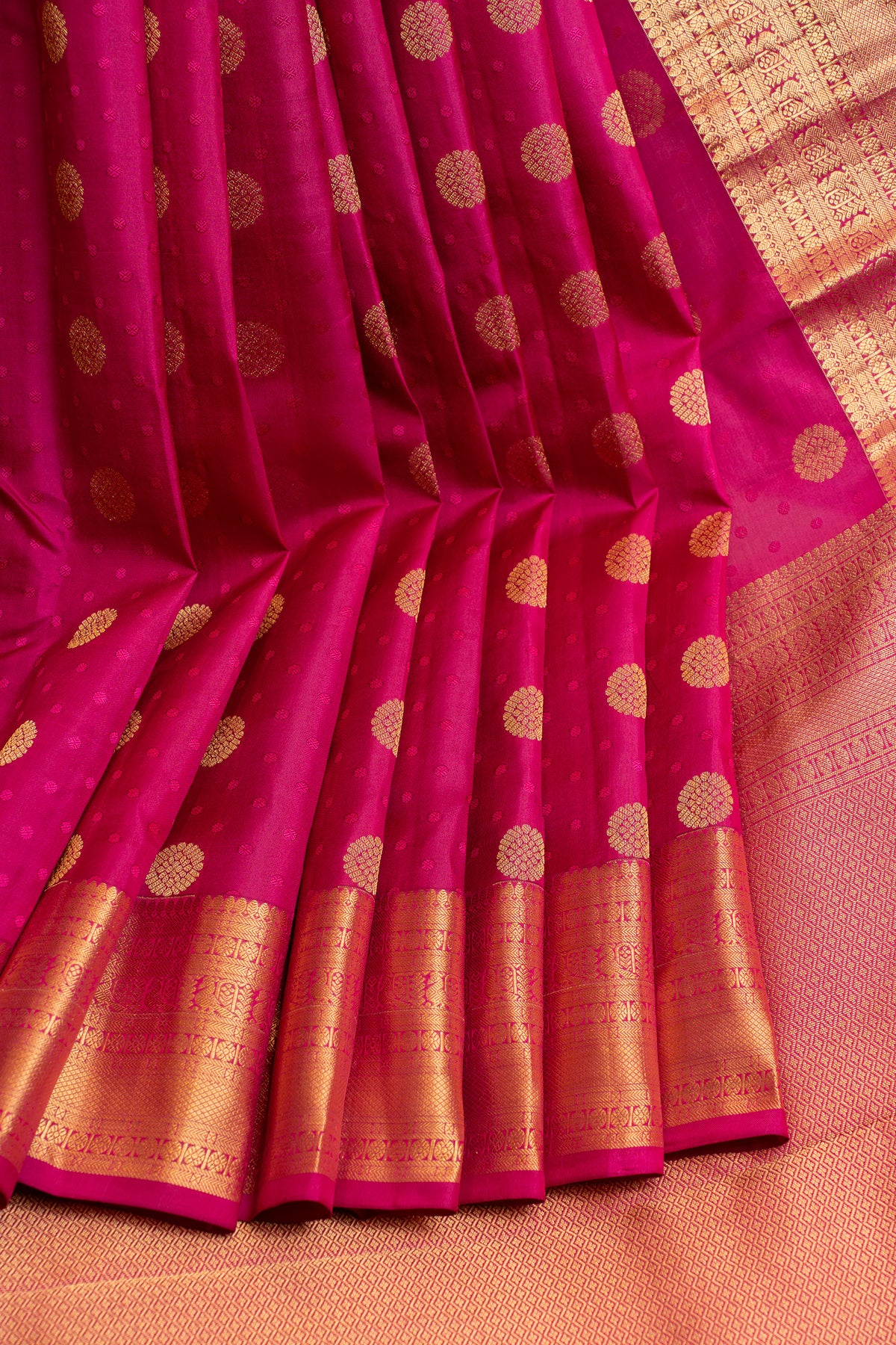 This magenta traditional pure Kanchipuram silk saree embodies timeless elegance with its rich hue and classic craftsmanship. Perfect for festive and formal occasions, it showcases the exquisite weaving techniques that define Kanchipuram silk, offering a sophisticated and graceful drape. Experience tradition and luxury in every fold.