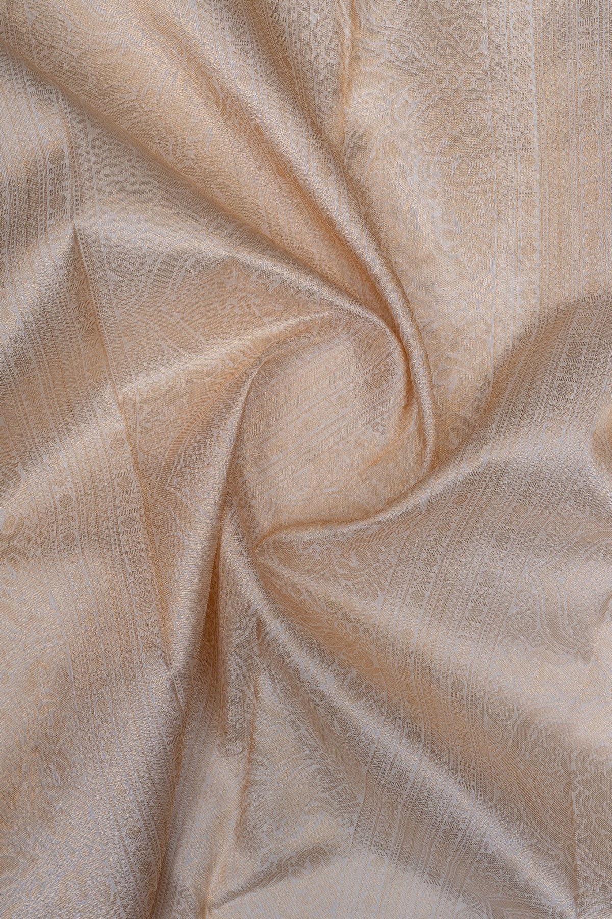 Elevate your ethnic wardrobe with this exquisite Kanchipuram silk saree, where timeless craftsmanship meets refined elegance. Woven from pure silk in a luxurious ivory base, the saree features intricate gold floral brocade work that catches light beautifully, creating an understated yet striking visual appeal. The traditional weaving technique ensures durability and a graceful drape, making it perfect for weddings, festivals, and special occasions. This versatile piece seamlessly transitions from formal events to cultural celebrations, offering the wearer an air of sophistication and grace.