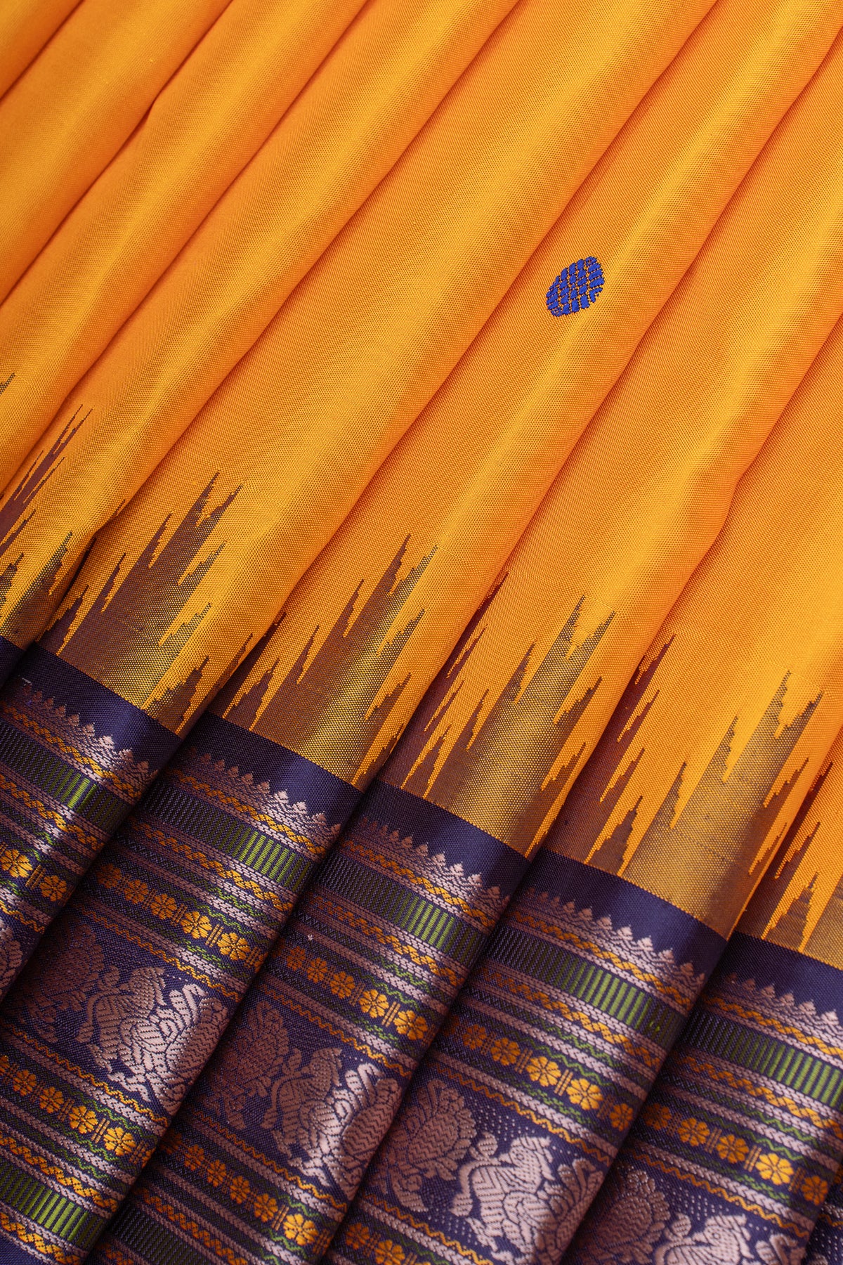 Celebrate refined elegance with this captivating mustard and purple threadwork saree, woven from pure Kanchipuram silk. The warm, golden mustard base provides a luxurious foundation, while intricate purple threadwork adds depth and visual intrigue. Kanchipuram silk's legendary craftsmanship delivers a sumptuous drape and enduring brilliance that transcends time. The striking colour combination exudes confidence and sophistication, making it an exceptional choice for weddings, cultural celebrations, and formal events. Each thread reflects generations of artisanal expertise, creating a piece that honours tradition while making a distinctly contemporary statement.