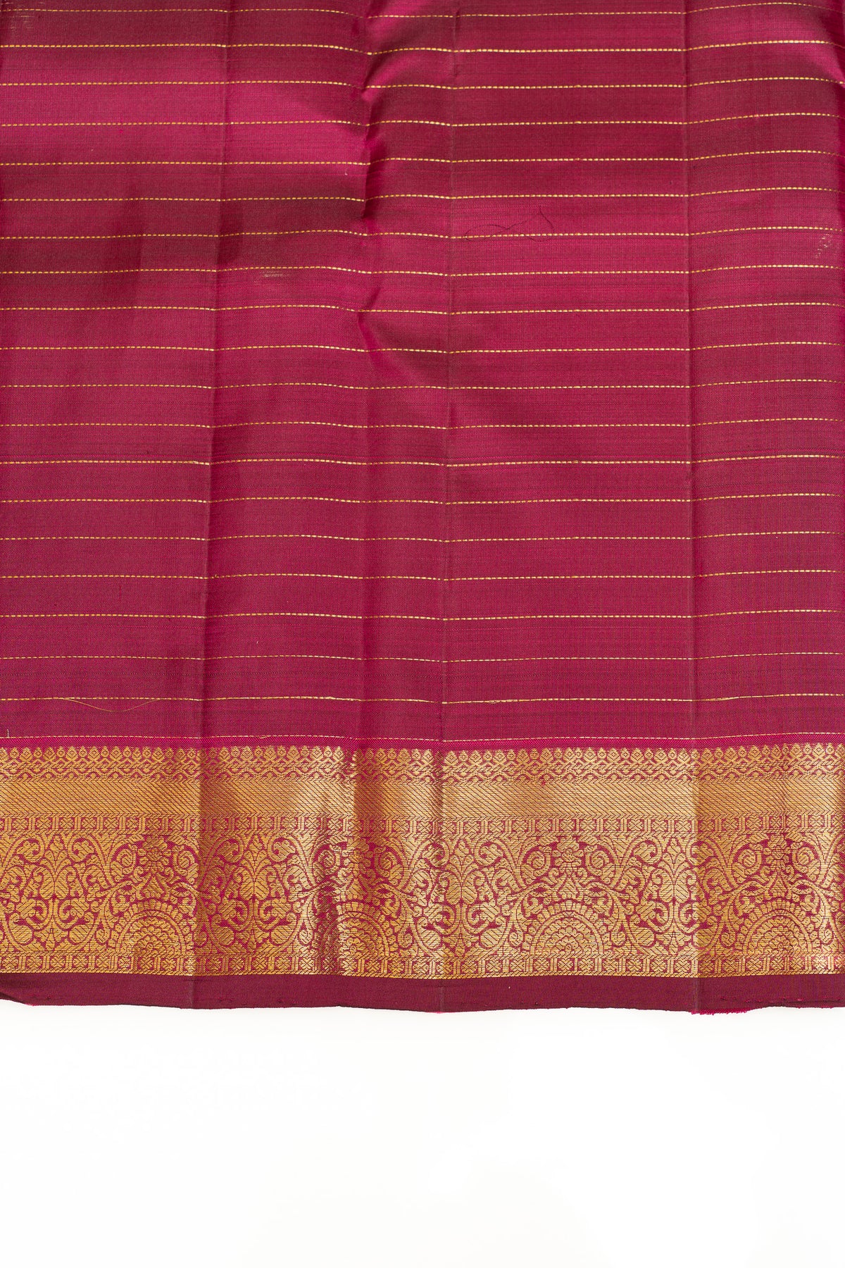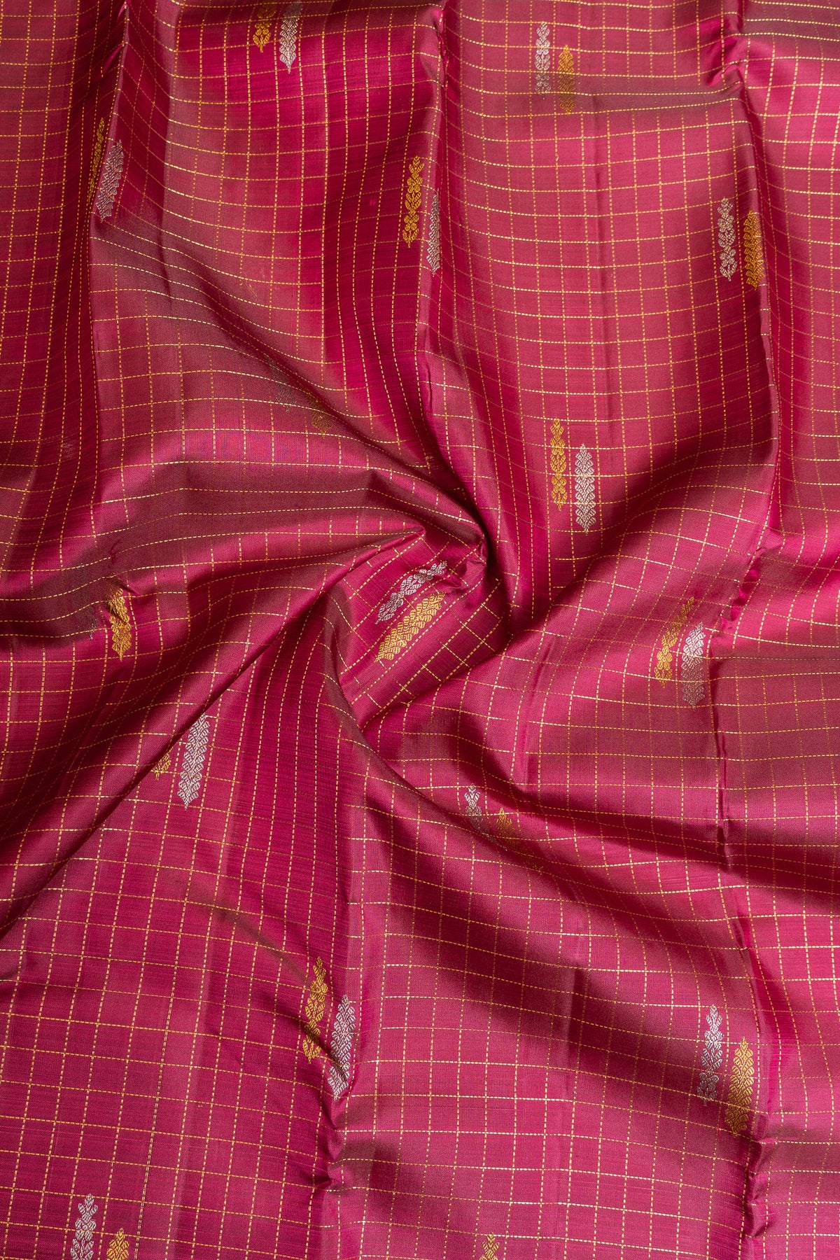 Radiate confidence with this Magenta Zari Checks pure Kanchipuram silk saree. Woven from authentic Kanchipuram silk, this striking piece showcases a geometric check pattern enriched with lustrous zari (gold thread) accents that dance across the fabric. The vibrant magenta hue commands presence while maintaining an air of refined elegance, making it perfect for celebrations, formal gatherings, and special occasions. The structured check design brings modern dimension to classical weaving traditions. Genuine Kanchipuram silk's natural radiance and superior drape create an impeccable silhouette, while its renowned durability ensures this saree becomes a treasured wardrobe staple. An exceptional choice for those seeking bold sophistication with enduring craftsmanship.