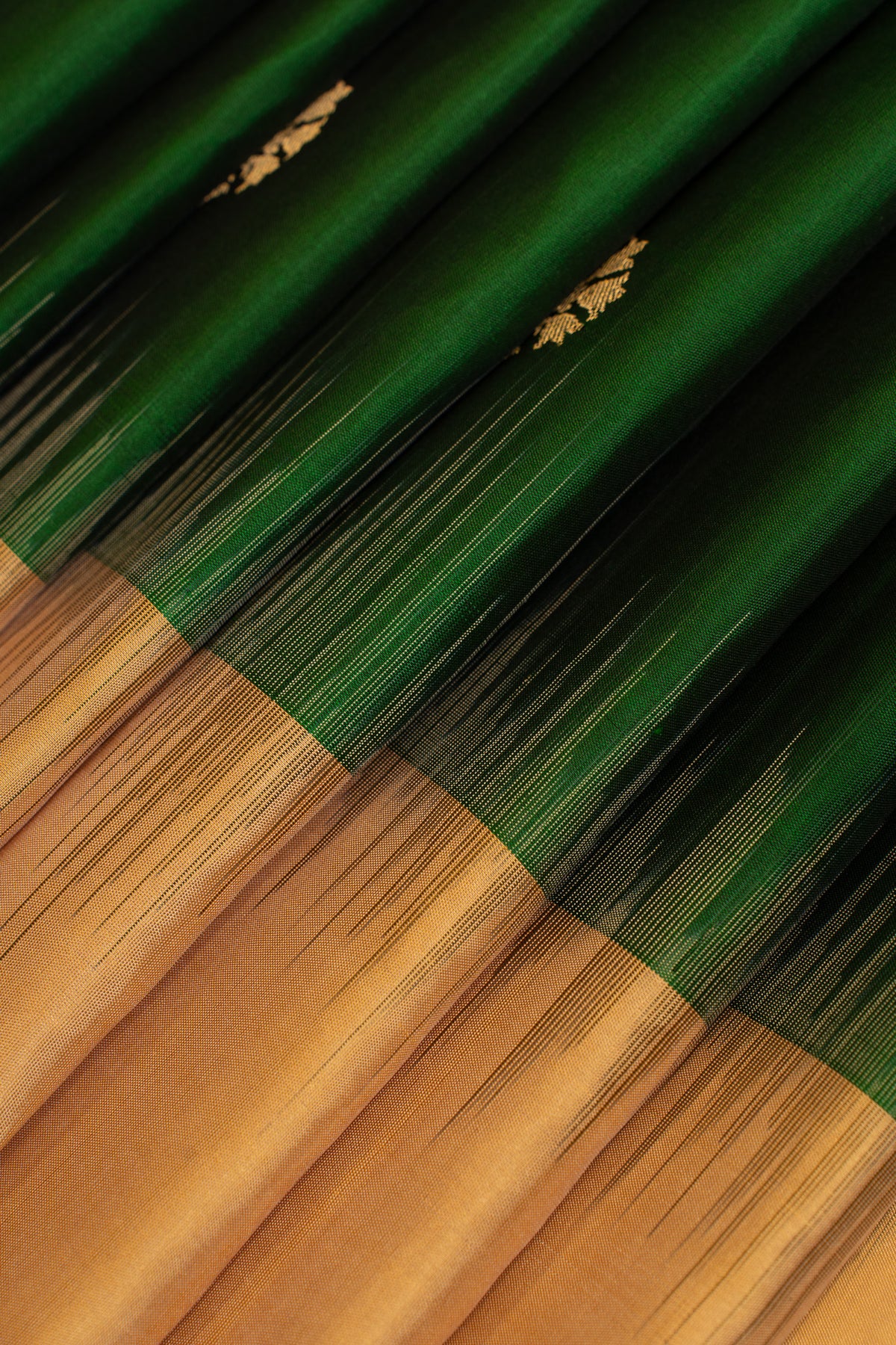 This emerald green and beige pure silk saree blends understated elegance with luxurious softness. Crafted from premium silk, its subtle color combination enhances its refined appeal, making it an exquisite choice for formal occasions and celebrations. Experience timeless sophistication with every drape.