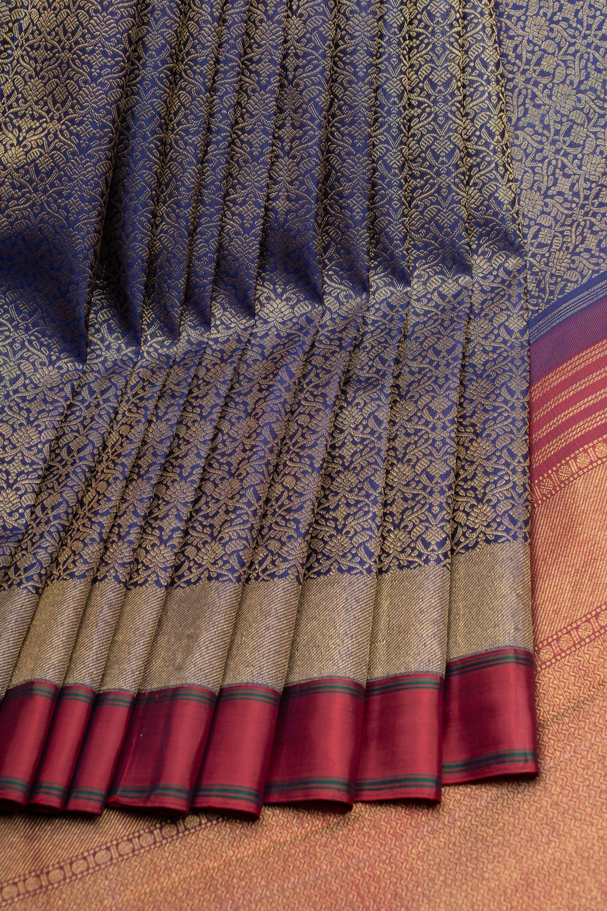 Unveil sophisticated allure with this exquisite Kanchipuram silk saree, featuring a striking interplay of deep blue and rich maroon enhanced by intricate brocade detailing. Crafted from pure silk, this saree represents the pinnacle of traditional South Indian weaving excellence, where every thread is placed with meticulous precision. The brocade work creates dimensional depth, revealing layers of artistry as light dances across the fabric. The jewel-toned color combination projects confidence and timeless grace, flattering all complexions while maintaining an air of refined elegance. Perfect for grand celebrations, formal occasions, and moments demanding presence, this saree transitions seamlessly from festive gatherings to evening events. The harmonious blend of blue and maroon creates visual richness without overwhelming the silhouette. A distinguished investment in authentic craftsmanship—a saree destined to become a cherished heirloom, celebrated across generations.