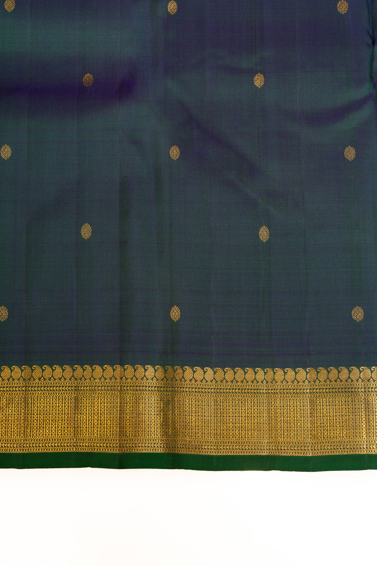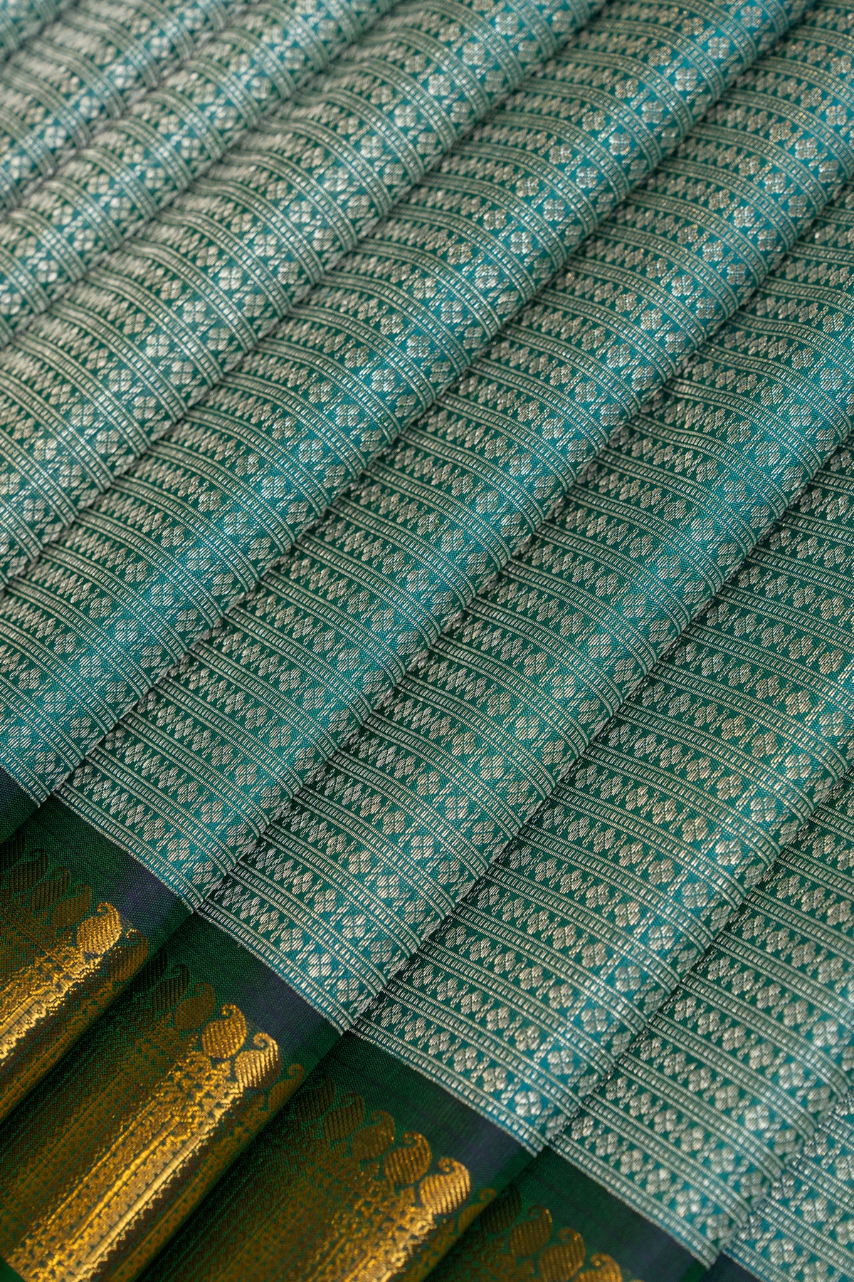 Indulge in opulent luxury with this exquisite blue Kanchipuram silk saree, embellished with intricate zari brocade work. Crafted from pure silk and adorned with traditional gold threadwork, this saree represents the pinnacle of South Indian textile artistry. The serene blue backdrop provides an elegant canvas for the shimmering zari patterns, creating a luminous effect that captures light beautifully. An heirloom-worthy piece ideal for grand celebrations, weddings, and momentous occasions where refined grandeur is paramount.