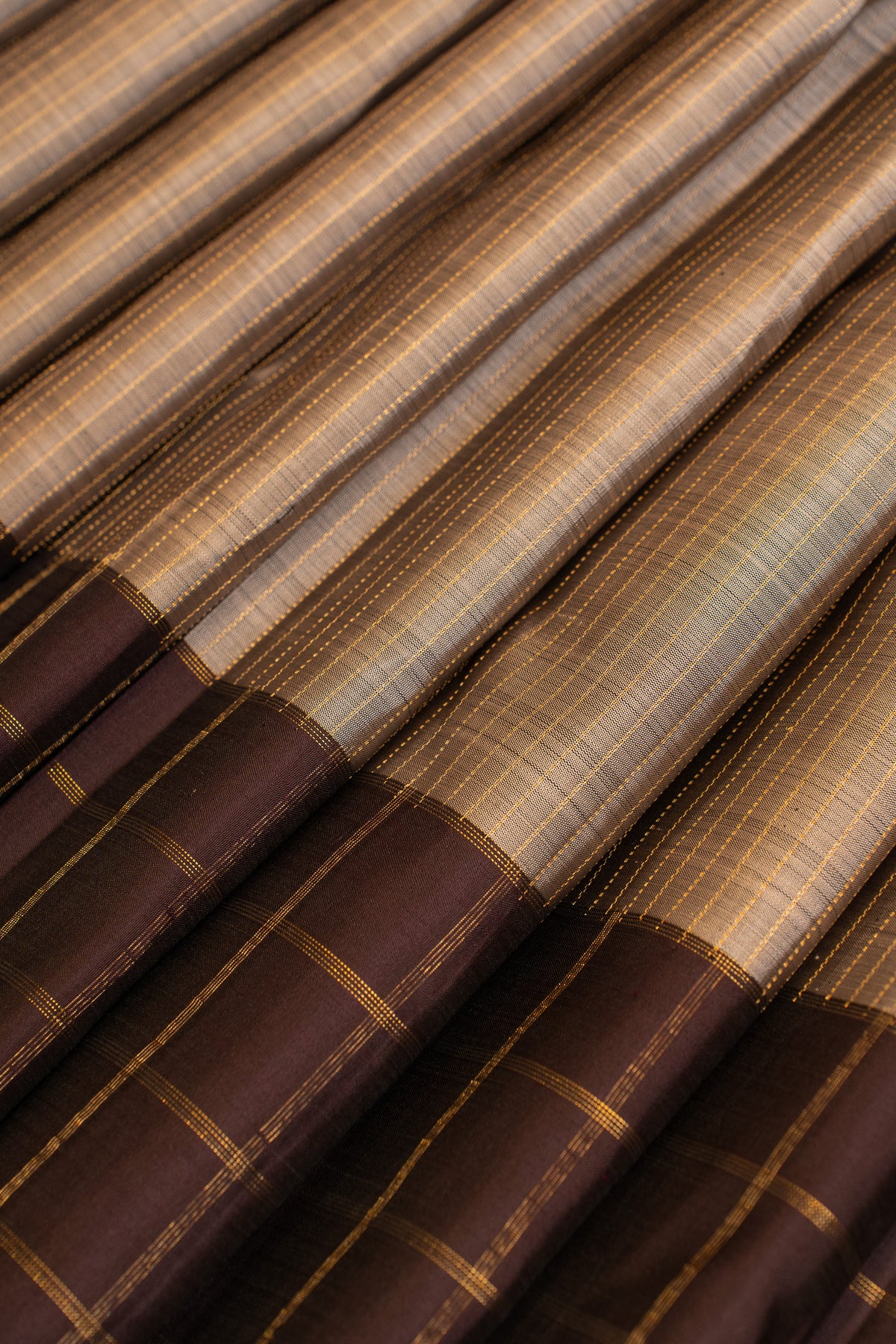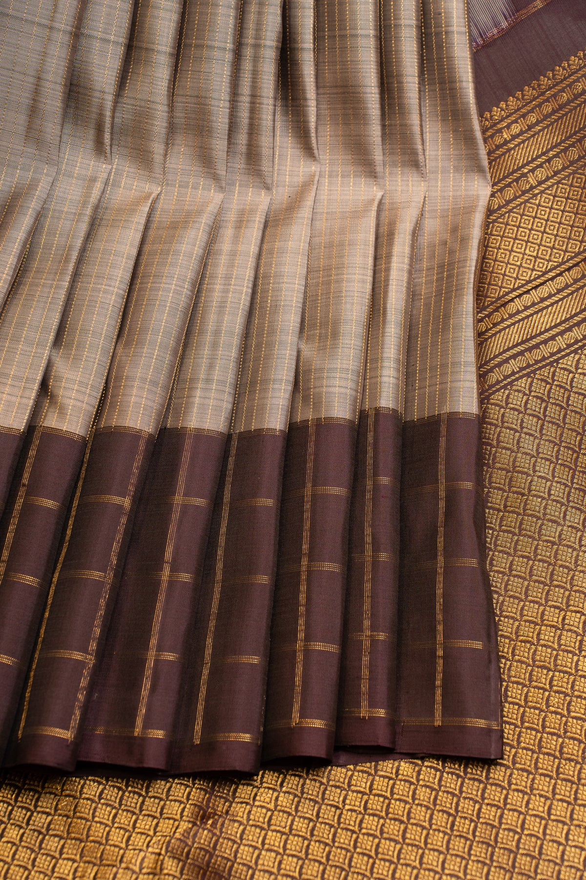 Grey and brown checks pure Kanchipuram silk saree
