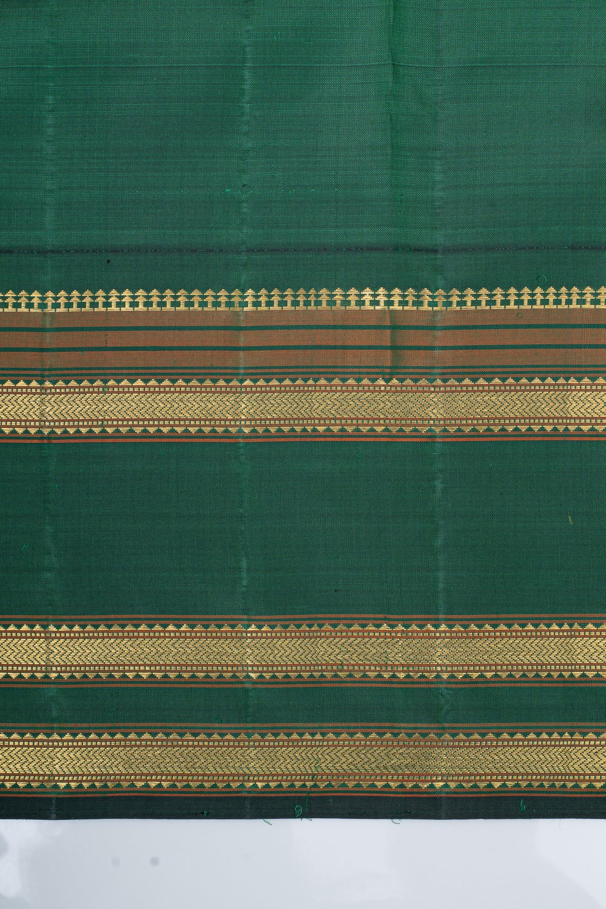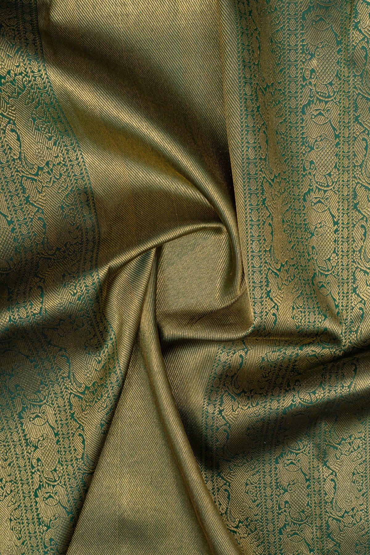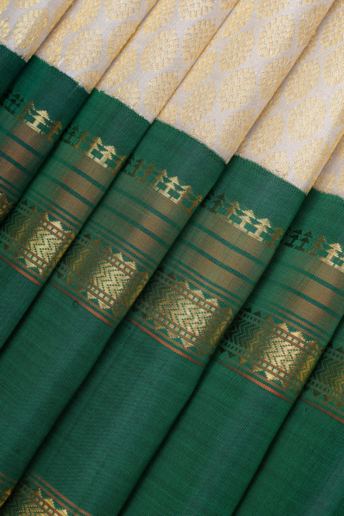 Exude timeless elegance with this ivory and green brocade pure Kanchipuram silk saree. The serene ivory base is beautifully complemented by rich green brocade work, creating a sophisticated and classic traditional look.Woven from luxurious pure Kanchipuram silk, this saree features a smooth texture, lustrous sheen, and graceful drape. Perfect for weddings, festive occasions, and cultural celebrations, it highlights the artistry of skilled South Indian weavers.
