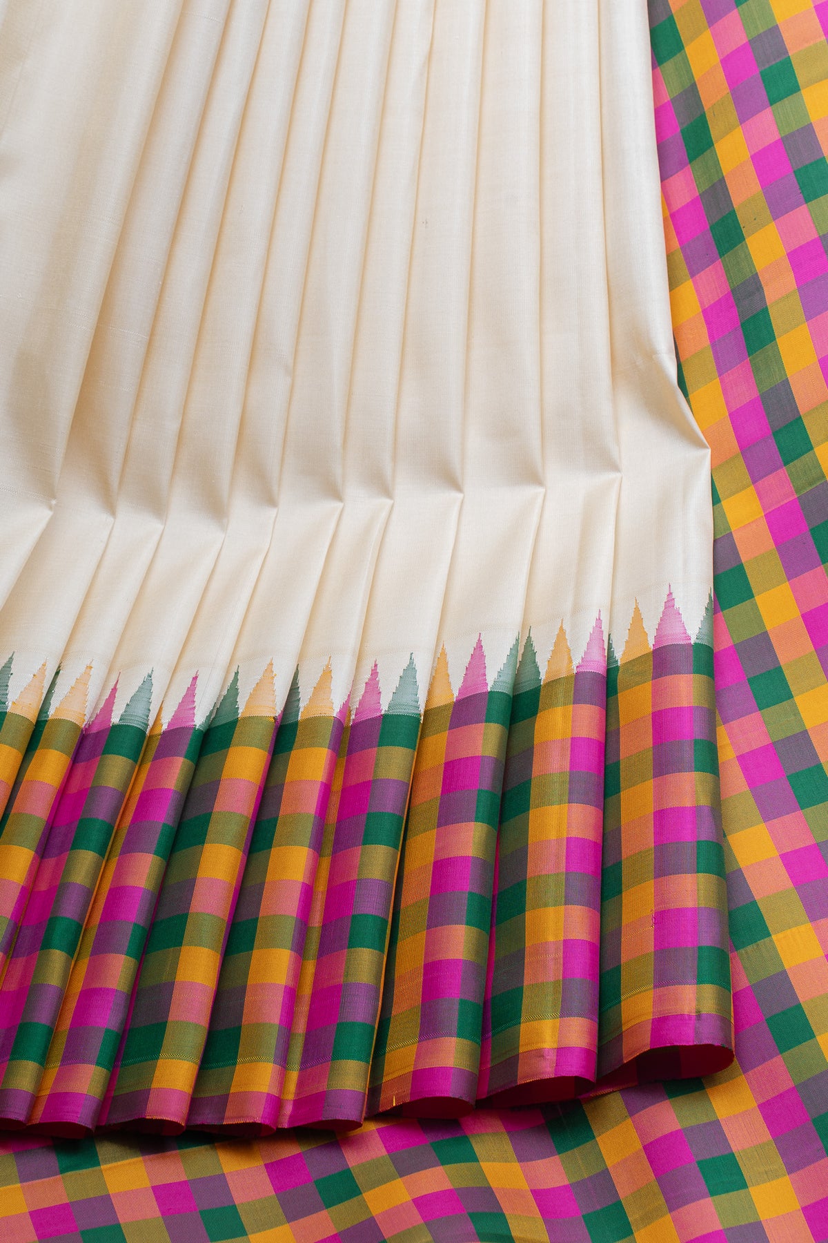 Step into timeless elegance with this ivory pure Kanchipuram silk saree featuring a sophisticated multi-checks border. The serene ivory base exudes grace, while the intricate multi-check border adds texture, contrast, and a contemporary touch to classic Kanchipuram craftsmanship.Woven from premium pure silk, this saree boasts a natural sheen, structured drape, and enduring quality. Its detailed border work enhances the overall visual appeal, making it ideal for weddings, festive celebrations, and formal occasions.