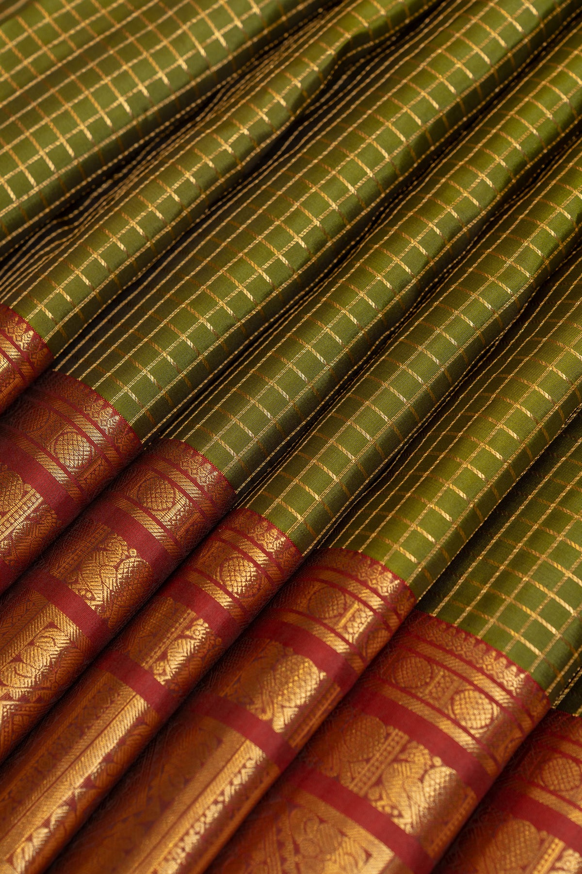 Mehendi green and red Vintage checks pure Kanchipuram silk saree