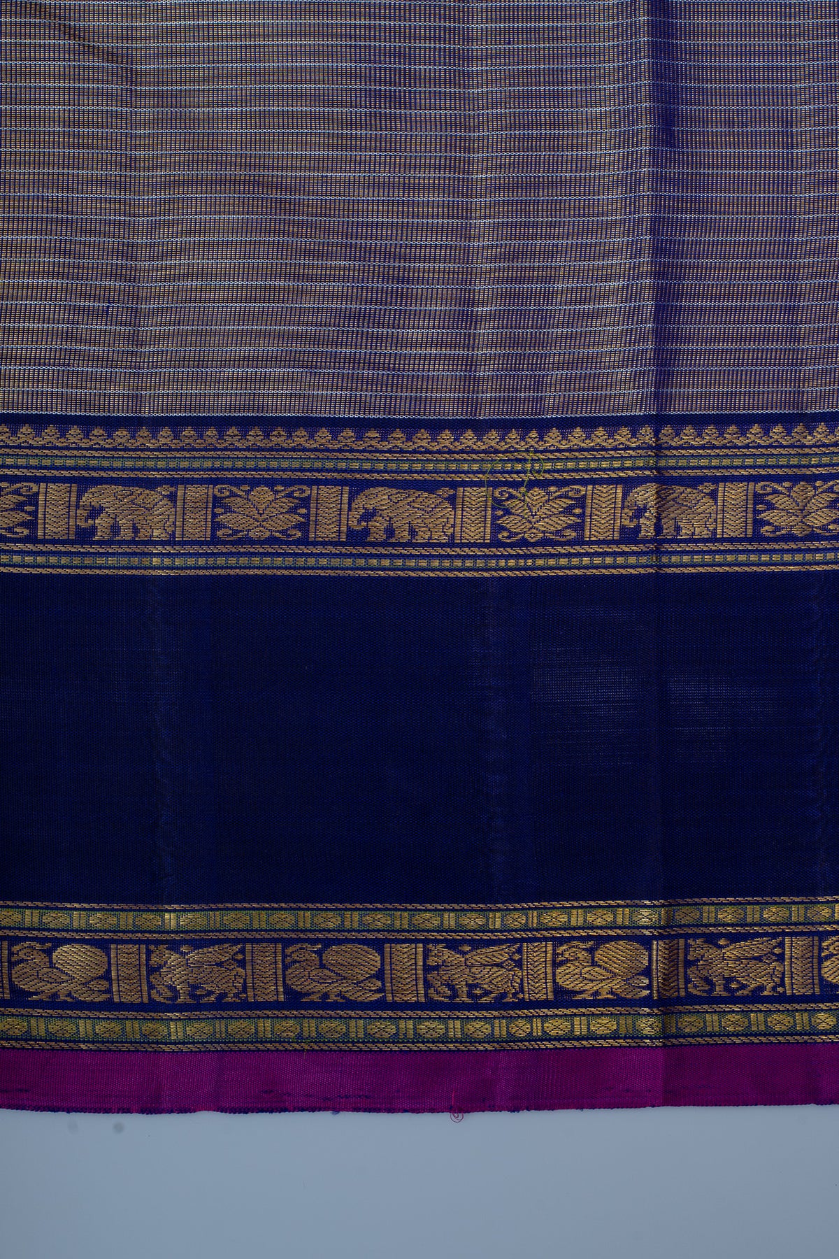 Elevate your collection with this navy blue Kanchipuram silk saree, adorned with intricate zari checks that catch the light beautifully. Crafted from pure silk, the geometric zari detailing adds a layer of refined opulence while maintaining understated elegance. The deep navy tone provides versatility, complementing various skin tones and occasions from intimate gatherings to grand celebrations. Handwoven by skilled artisans using traditional techniques, this saree exemplifies the prestige of Kanchipuram weaving. A sophisticated investment piece for those who appreciate the marriage of classic design, premium materials, and authentic Indian textile excellence.