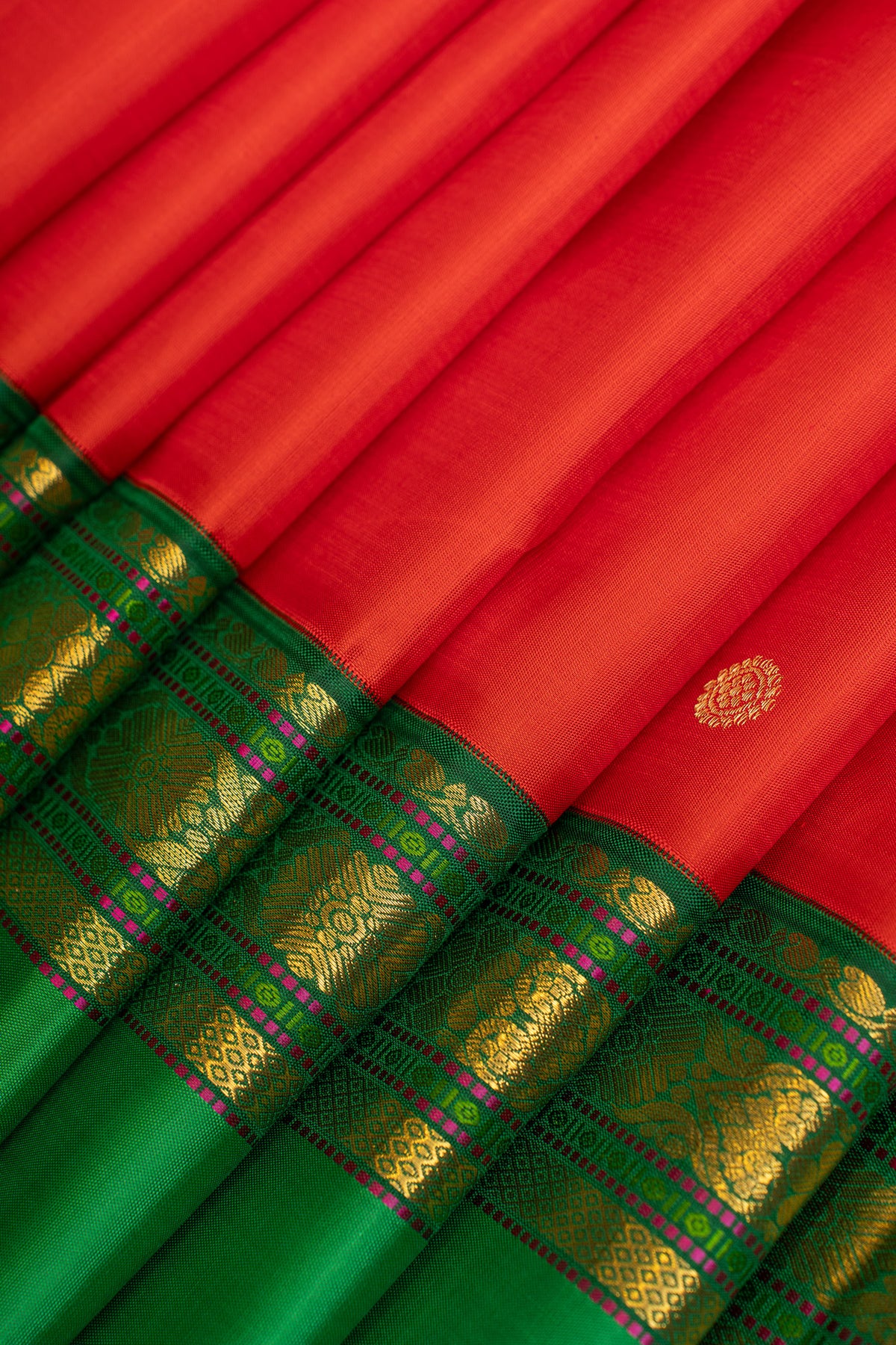 Experience timeless elegance with this red and green rettai pettu pure Kanchipuram silk saree. Crafted from premium silk, its dual-tone body showcases the exquisite art of traditional weaving, offering a graceful drape and rich texture. Perfect for festive occasions and special events, this saree embodies sophistication while highlighting cultural heritage with every thread.