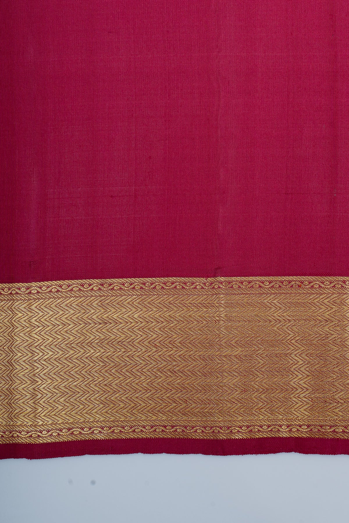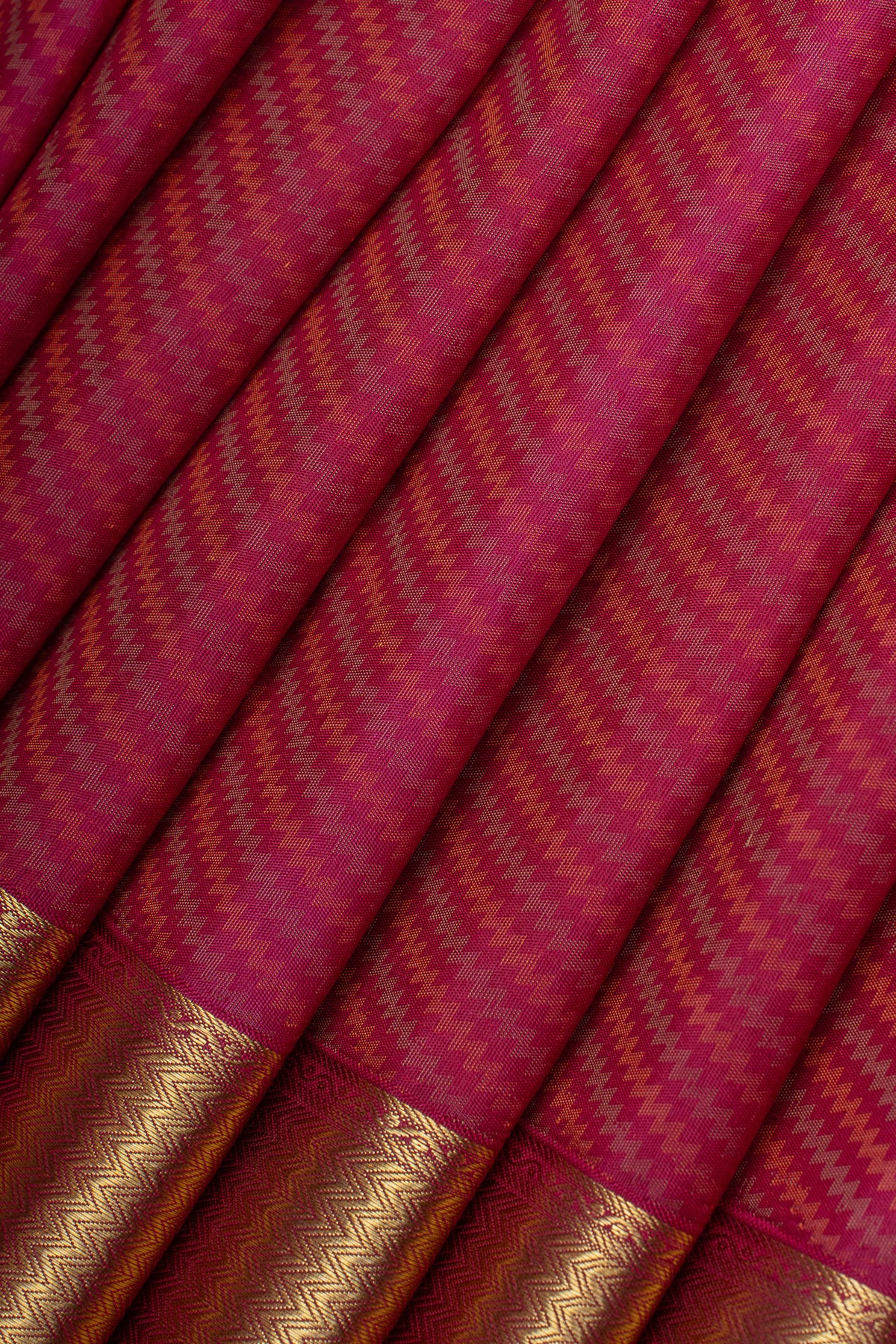 This striking red Kanchipuram silk saree features an intricate chevron jacquard weave that adds contemporary flair to a time-honored textile tradition. Woven from pure silk, the fabric delivers a luxurious drape and natural sheen that elevates any occasion. The geometric chevron pattern creates visual depth while maintaining the refined elegance Kanchipuram silks are celebrated for. Ideal for discerning wearers seeking a balance between classic heritage and modern design sensibility. A versatile investment piece for celebrations, formal events, and special moments.