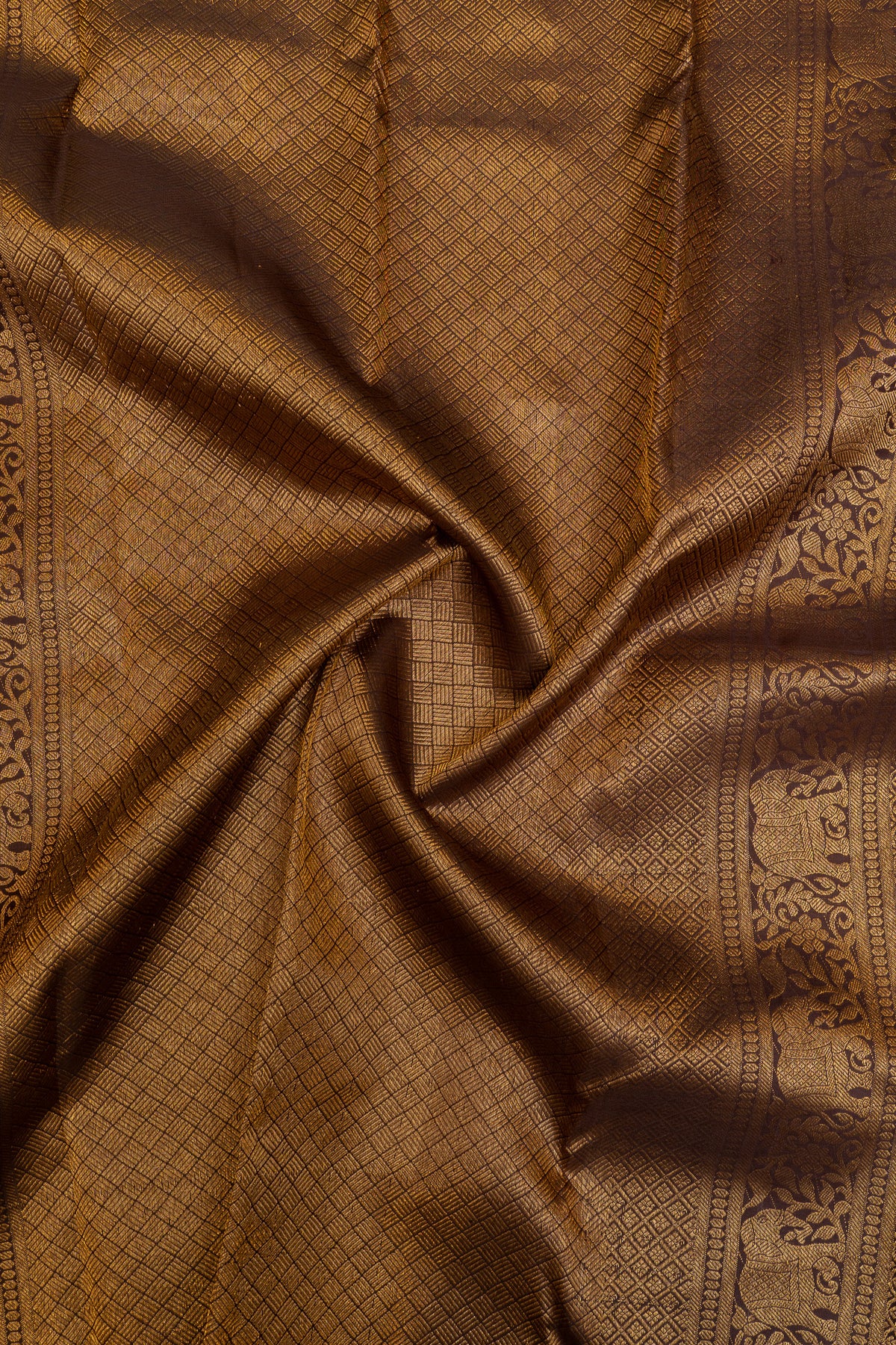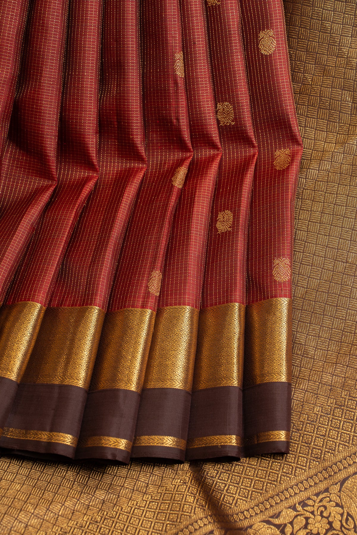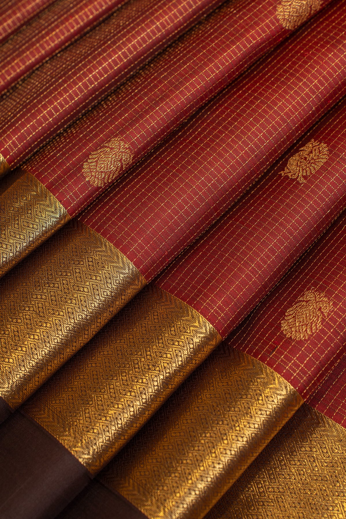 Elevate your ethnic wardrobe with this rust orange pure Kanchipuram silk saree, adorned with elegant zari checks. Crafted with traditional weaving techniques, it offers a rich texture and timeless appeal. Perfect for festive occasions and celebrations, this saree combines classic charm with sophisticated style for a graceful look.