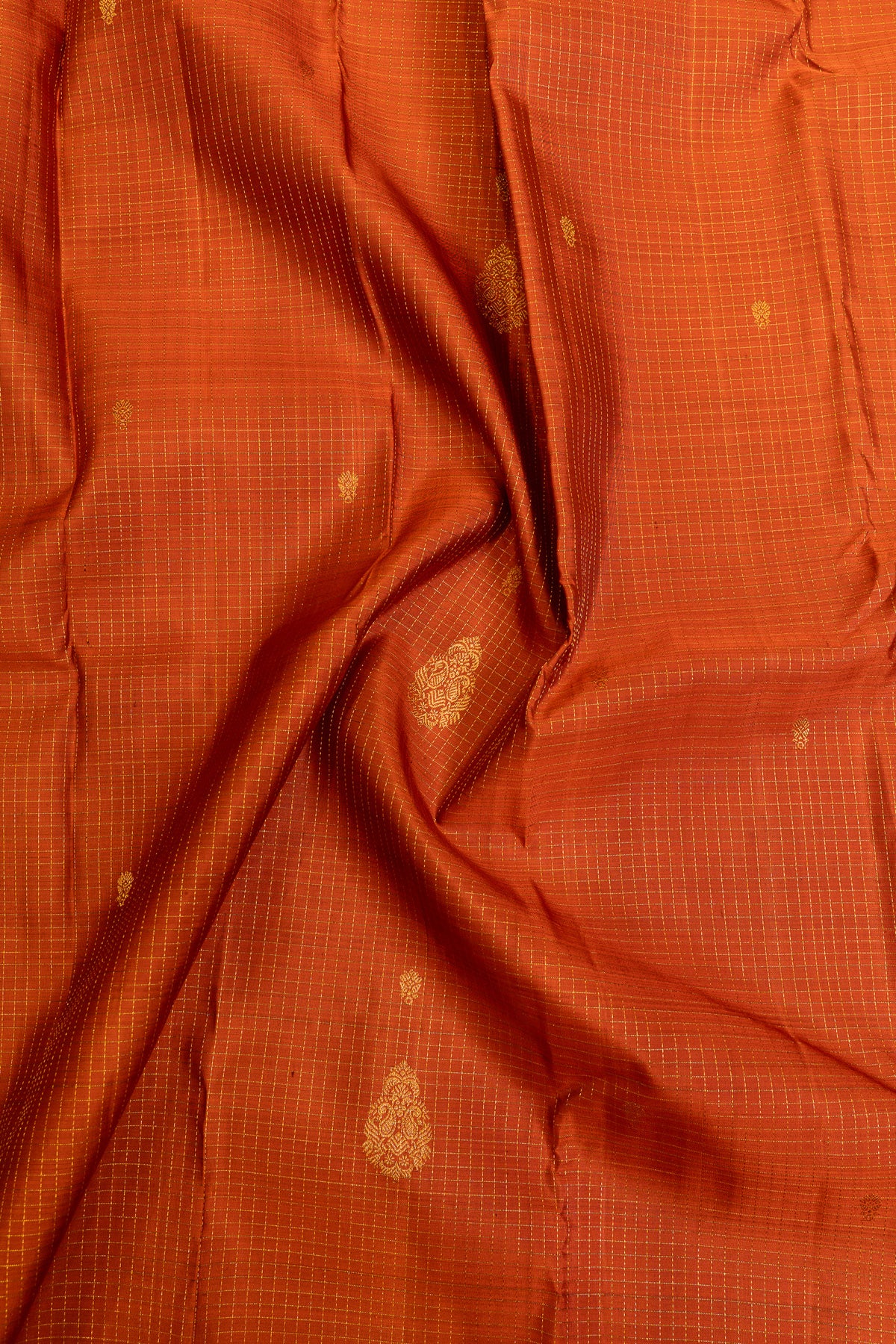 Embrace warmth and elegance with this captivating rust orange Zari checks Kanchipuram silk saree. Meticulously woven from pure silk, this saree features intricate geometric checks adorned with lustrous zari (gold thread) accents that catch light beautifully. The rich rust orange tone exudes confidence and sophistication, complementing a wide range of complexions while remaining seasonally versatile. The traditional checkered pattern, enhanced by shimmering metallic details, pays homage to centuries of South Indian textile artistry. Drape this luxurious fabric with pride at weddings, festivals, and special occasions—a statement piece that seamlessly blends heritage craftsmanship with contemporary style sensibilities.
