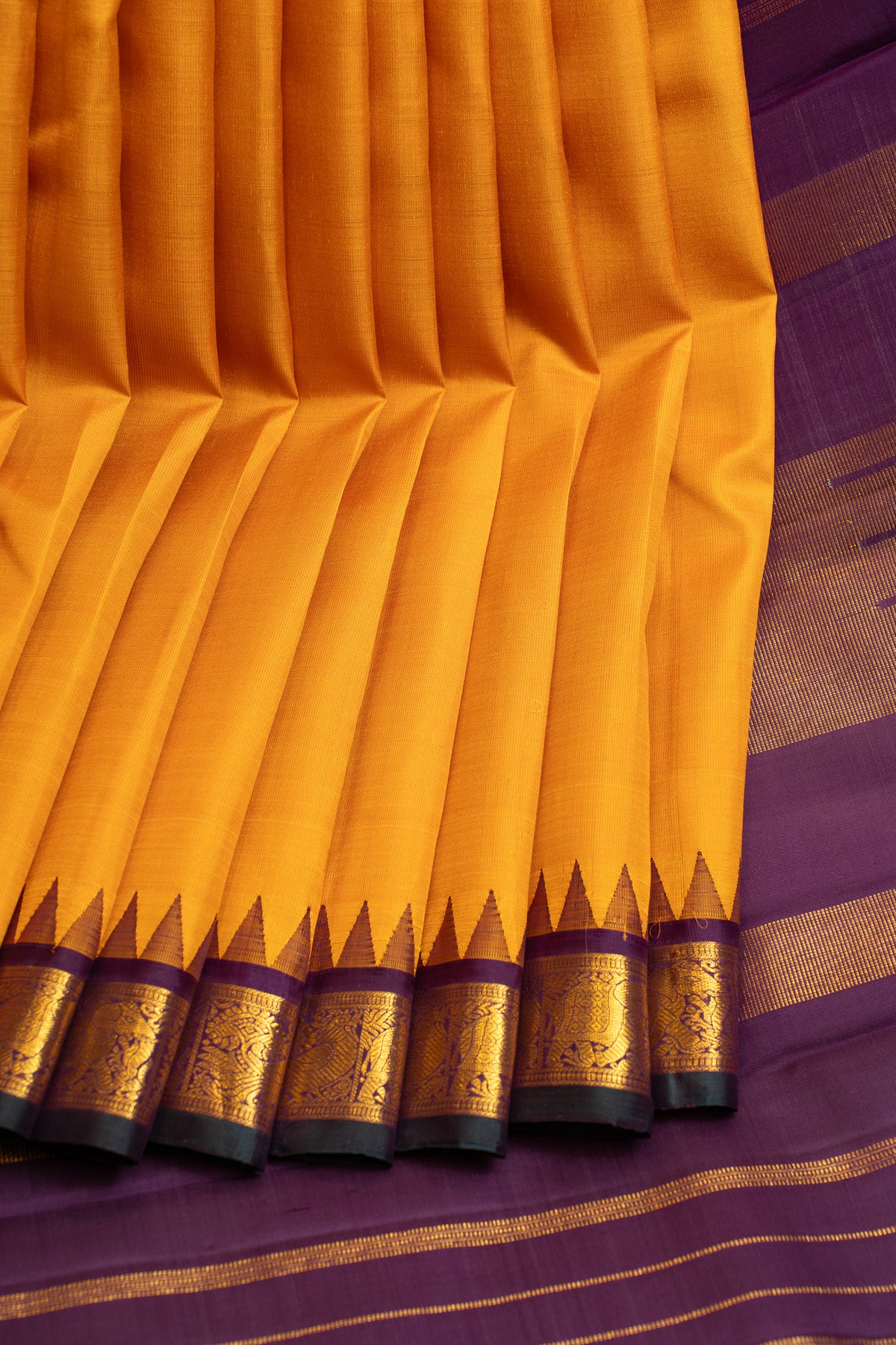 This yellow and purple traditional pure Kanchipuram silk saree exemplifies classic elegance. Woven with rich silk, it features vibrant hues that highlight timeless craftsmanship. Perfect for festive and ceremonial occasions, it offers a sophisticated statement through its harmonious color combination and impeccable texture.