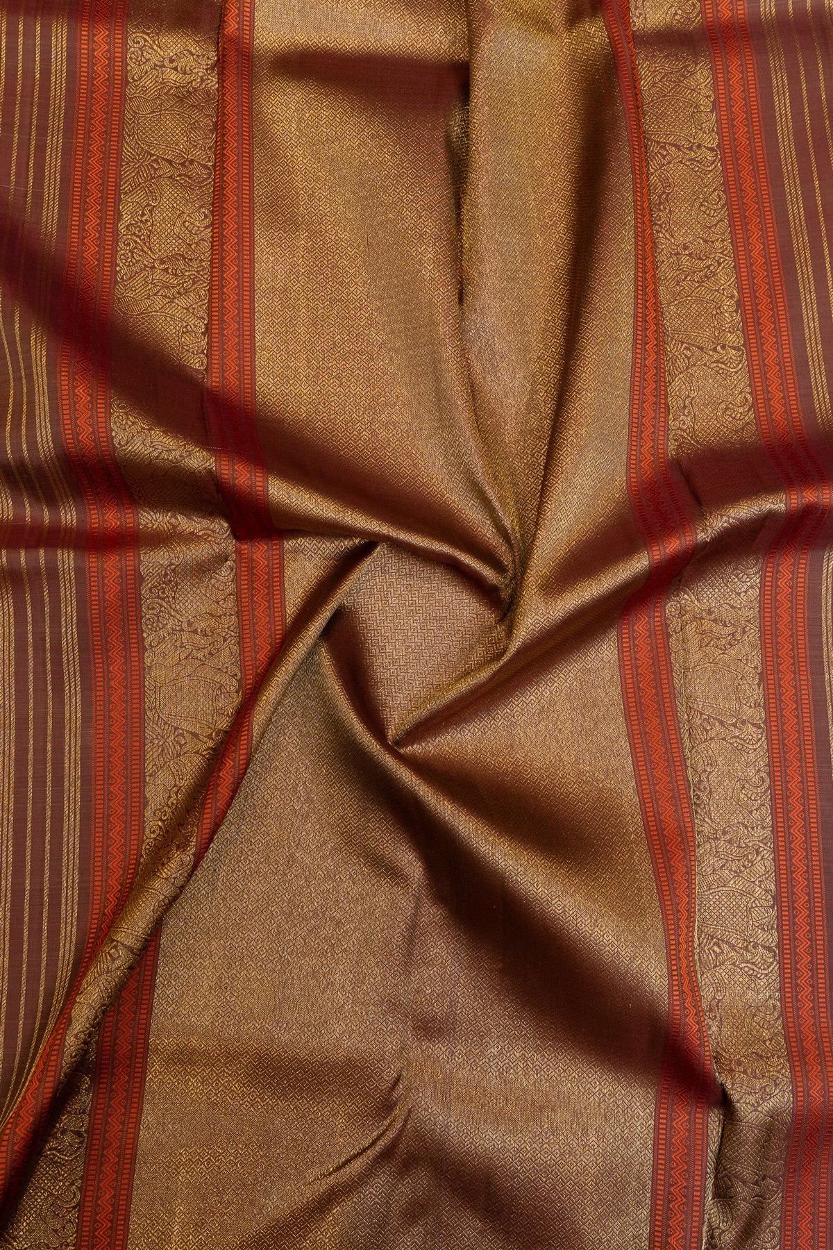 Indulge in understated refinement with this vintage-inspired Kanchipuram silk saree, where soft pink and warm brown checks create a harmonious, timeless aesthetic. Crafted from pure silk, this saree marries classic geometric patterns with the luxurious sheen that defines authentic Kanchipuram weaving. The subtle check design offers a contemporary twist on traditional elegance, making it ideal for those who seek distinction beyond conventional solid hues. The fabric's natural drape and inherent durability ensure graceful movement and lasting beauty, while the sophisticated color combination flatters diverse complexions. A refined choice for the discerning wearer who values heritage craftsmanship and understated style.