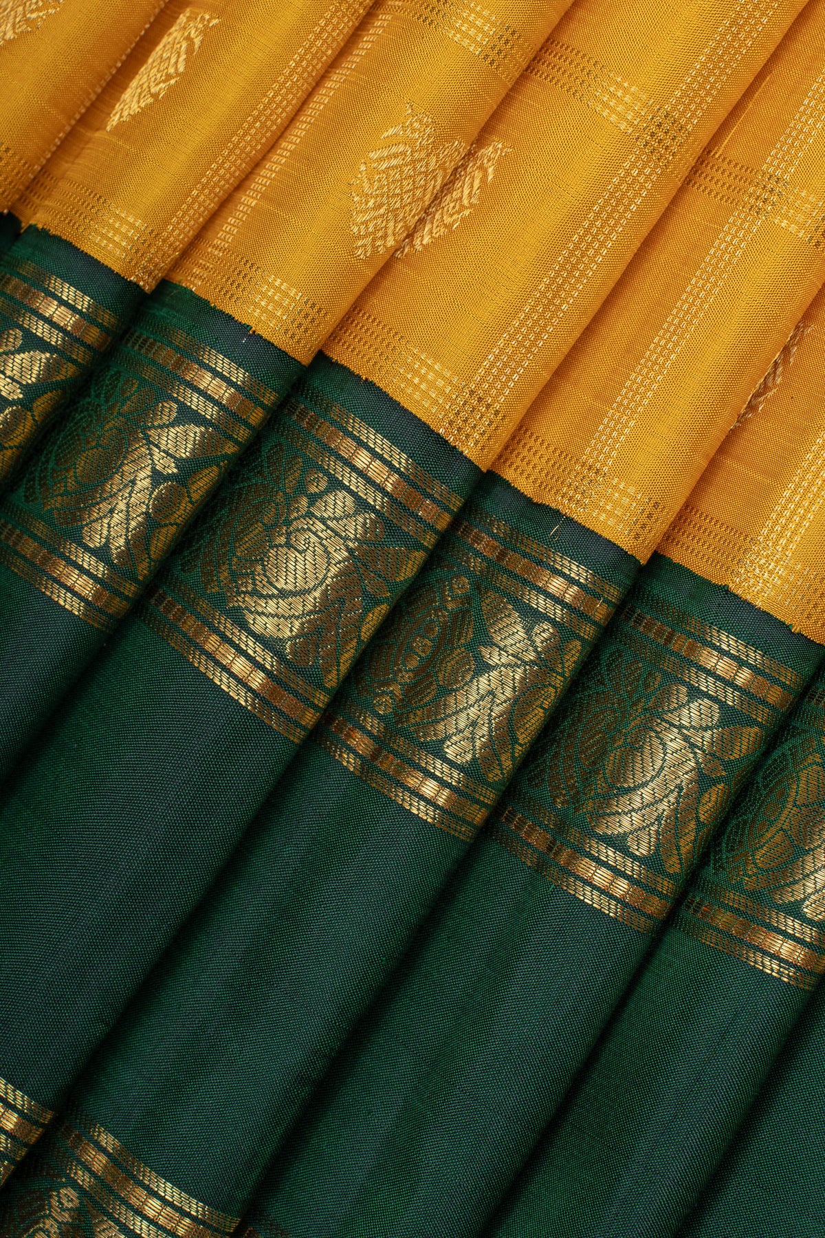 Golden yellow and green iruthalaipakshi vintage checks pure kanchipuram silk saree