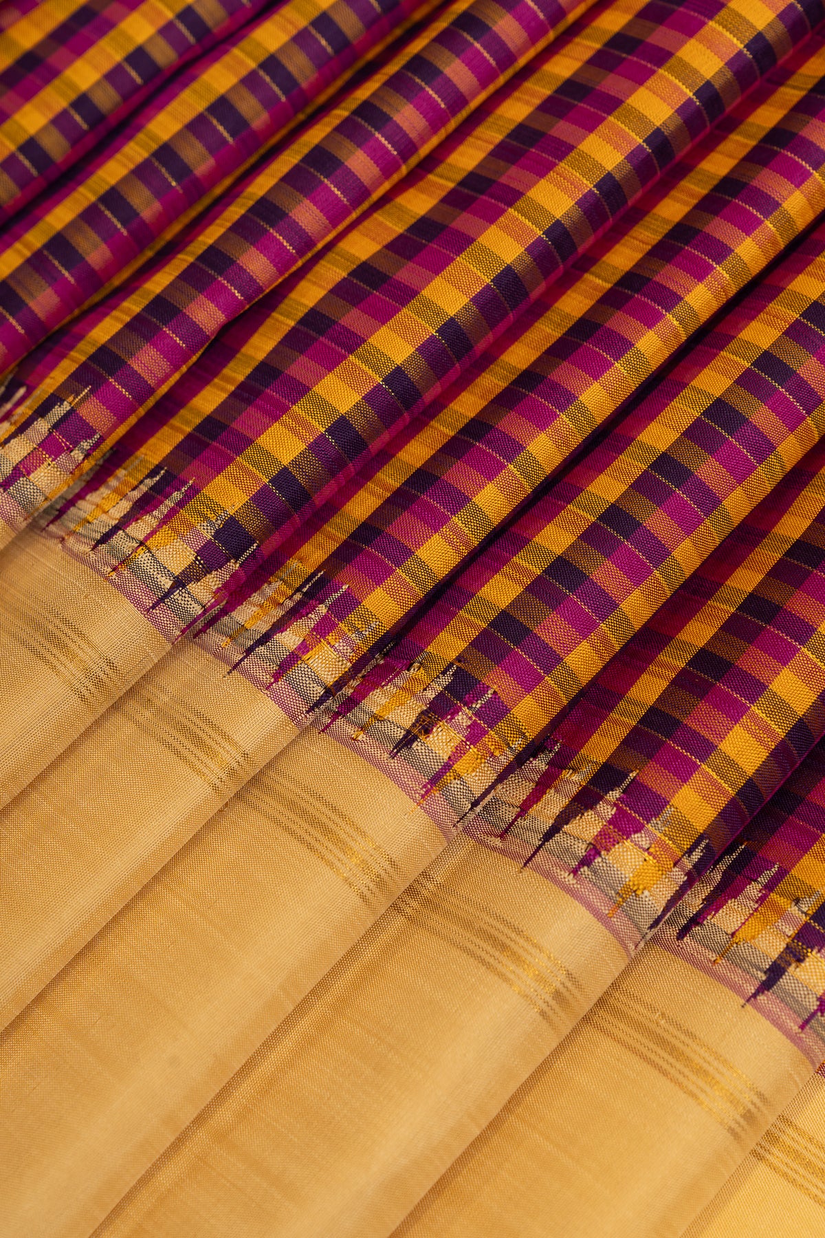 Celebrate understated sophistication with this captivating Multi Checks and Ivory pure Kanchipuram silk saree, a contemporary take on traditional weaving. Crafted from premium Kanchipuram silk, this saree features a refined geometric pattern that adds visual interest while maintaining timeless appeal. The neutral ivory base paired with vibrant multi-colored checks creates a versatile piece suitable for both formal occasions and festive celebrations. Experience the signature lustre and fluid drape of authentic Kanchipuram silk, ensuring you radiate elegance with every wear.