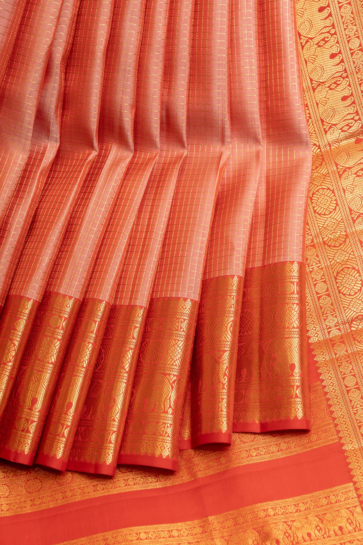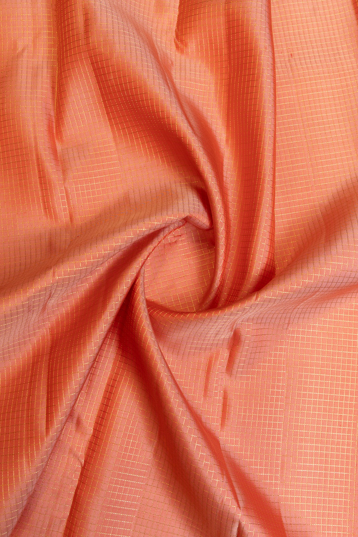 Embrace vintage charm with this peach and red checks pure Kanchipuram silk saree, a harmonious blend of warm hues and classical design. Handwoven from authentic Kanchipuram silk, this six-yard creation features a captivating interplay of soft peach and deep red in a timeless checked pattern. The vintage aesthetic evokes nostalgia while maintaining contemporary relevance, making it ideal for those who appreciate heritage with character. The fabric's natural lustre and substantial body ensure impeccable draping and longevity. Perfect for festive occasions and celebrations, this saree celebrates the artistry of traditional South Indian looms. An investment piece that transcends trends, it represents authentic craftsmanship and enduring elegance for the discerning collector.