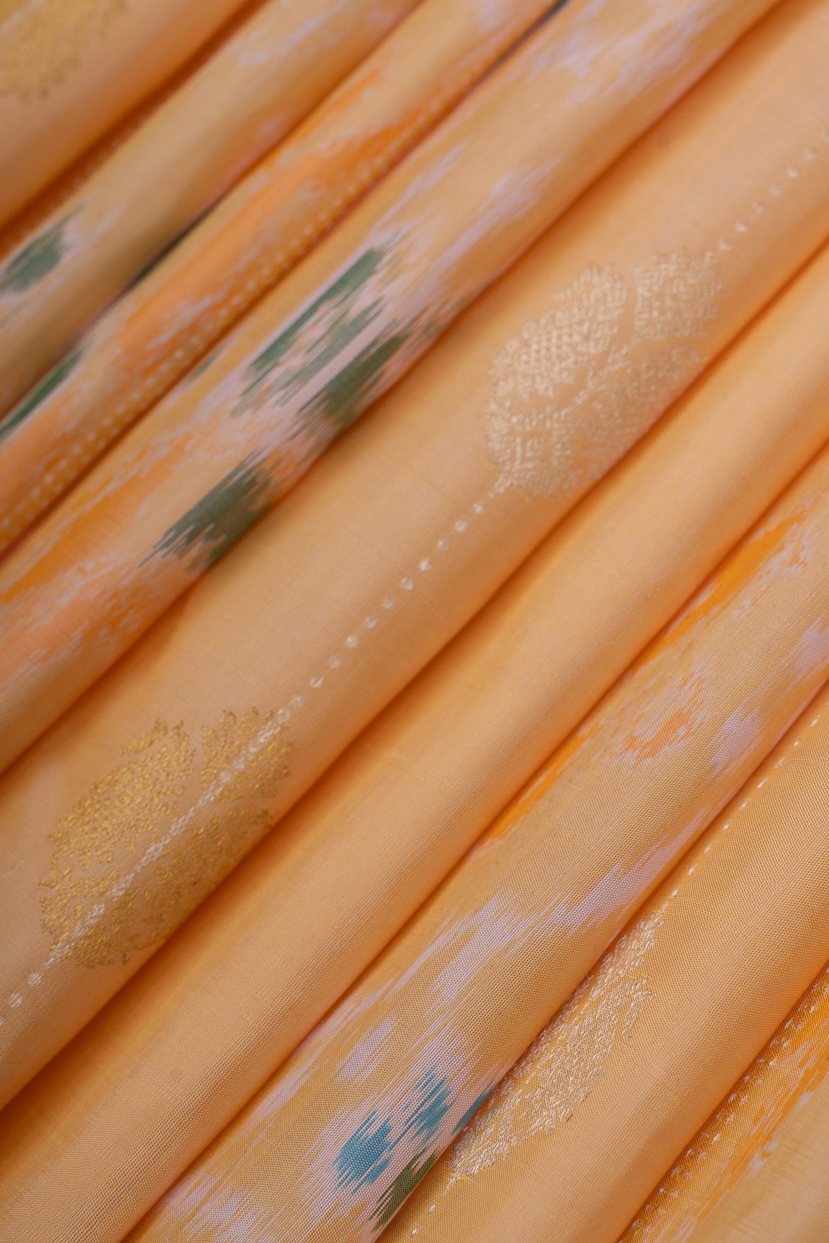 Embrace timeless elegance with this exquisite peach ikat pure Kanchipuram silk saree. Handcrafted using traditional weaving techniques, this saree showcases the distinctive ikat pattern—a centuries-old art form that creates mesmerizing geometric designs through resist-dyeing. The lustrous pure silk fabric drapes beautifully, offering both comfort and grace for special occasions. Rich in heritage and refined in execution, this piece celebrates the artistry of South Indian textile craftsmanship, making it a treasured addition to any discerning wardrobe.