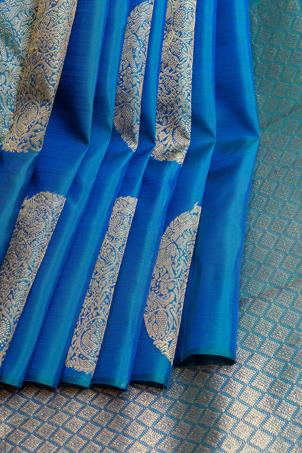 Peacock blue borderless pure Kanchipuram silk saree