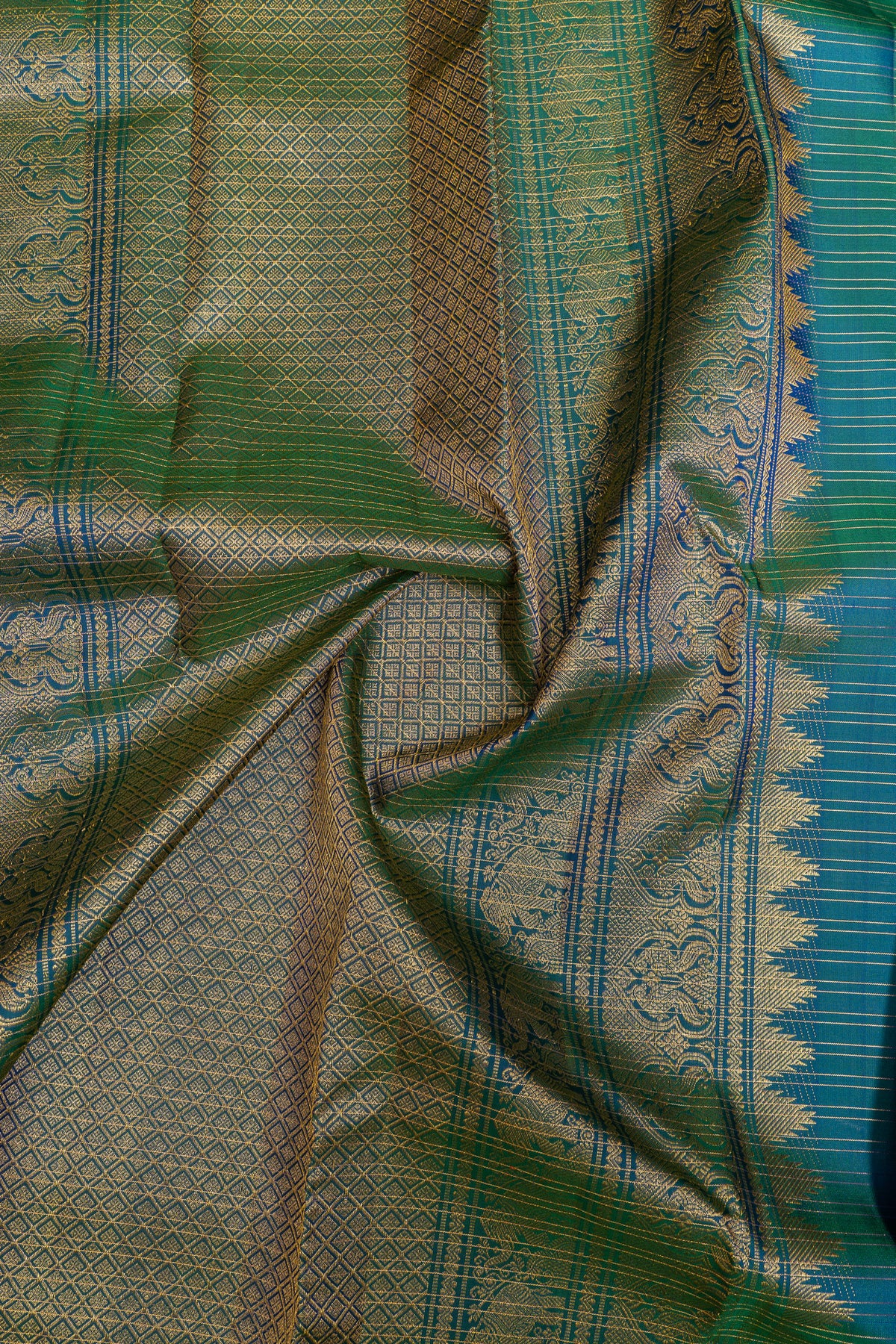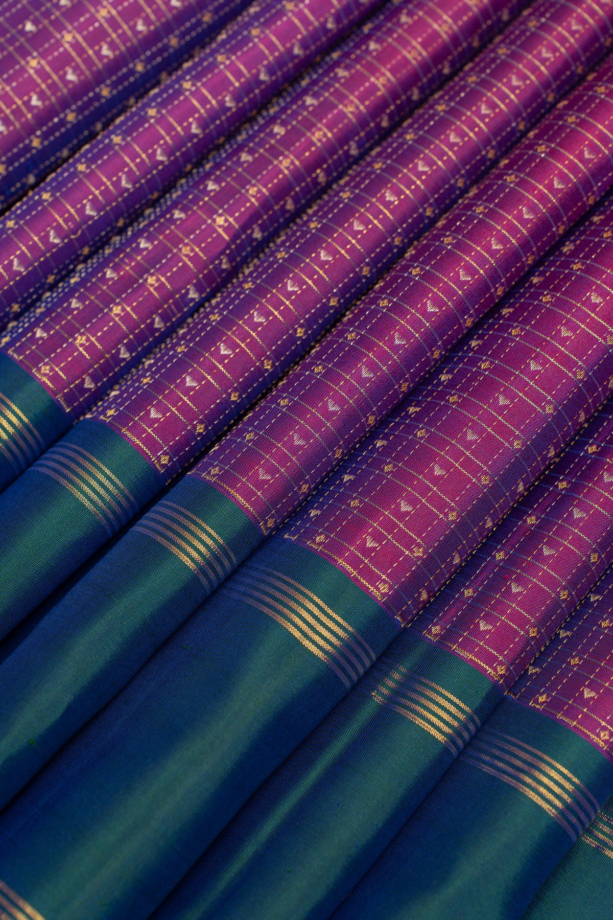 Unveil the enchanting allure of this purple and peacock blue Kanchipuram silk saree, where jewel tones converge to create an mesmerizing visual symphony. The regal purple harmonizes beautifully with the luminous peacock blue, producing a sophisticated color narrative that captivates and inspires. Constructed from pure Kanchipuram silk, this saree exemplifies the fabric's legendary suppleness and lustrous sheen, ensuring graceful draping and enduring beauty. The harmonious color composition flatters diverse complexions while maintaining an air of refined elegance suitable for weddings, formal celebrations, and significant life events. This heirloom-quality piece represents the pinnacle of South Indian weaving mastery, combining centuries-old techniques with timeless aesthetic appeal—a distinguished investment that celebrates both heritage and contemporary sophistication.