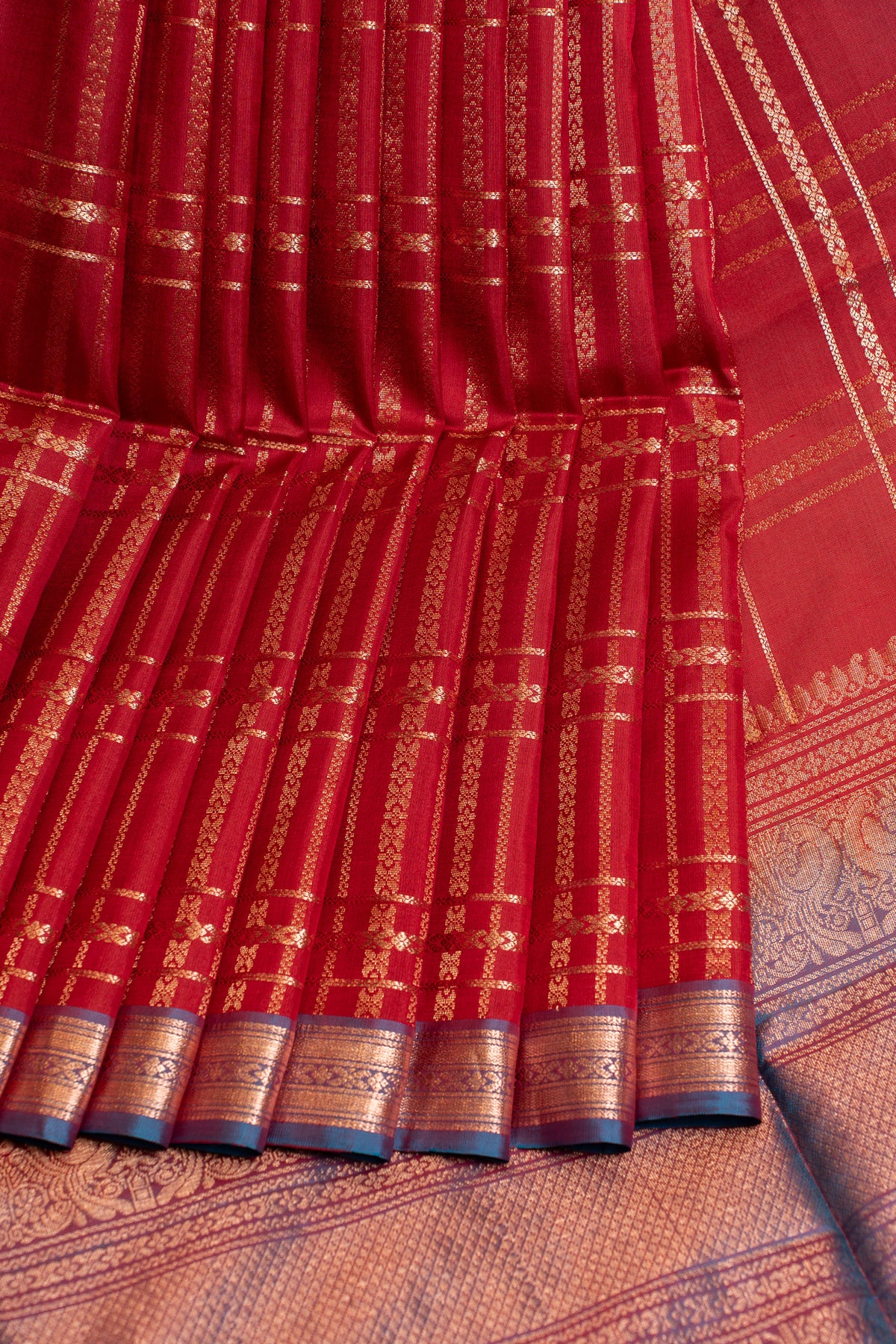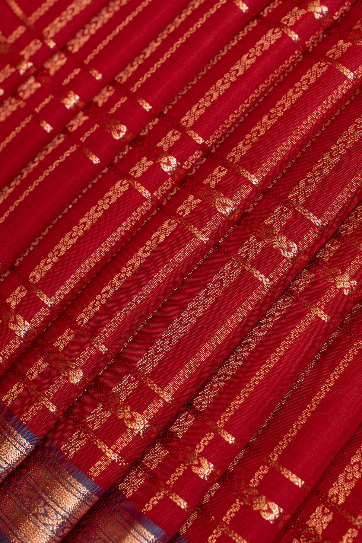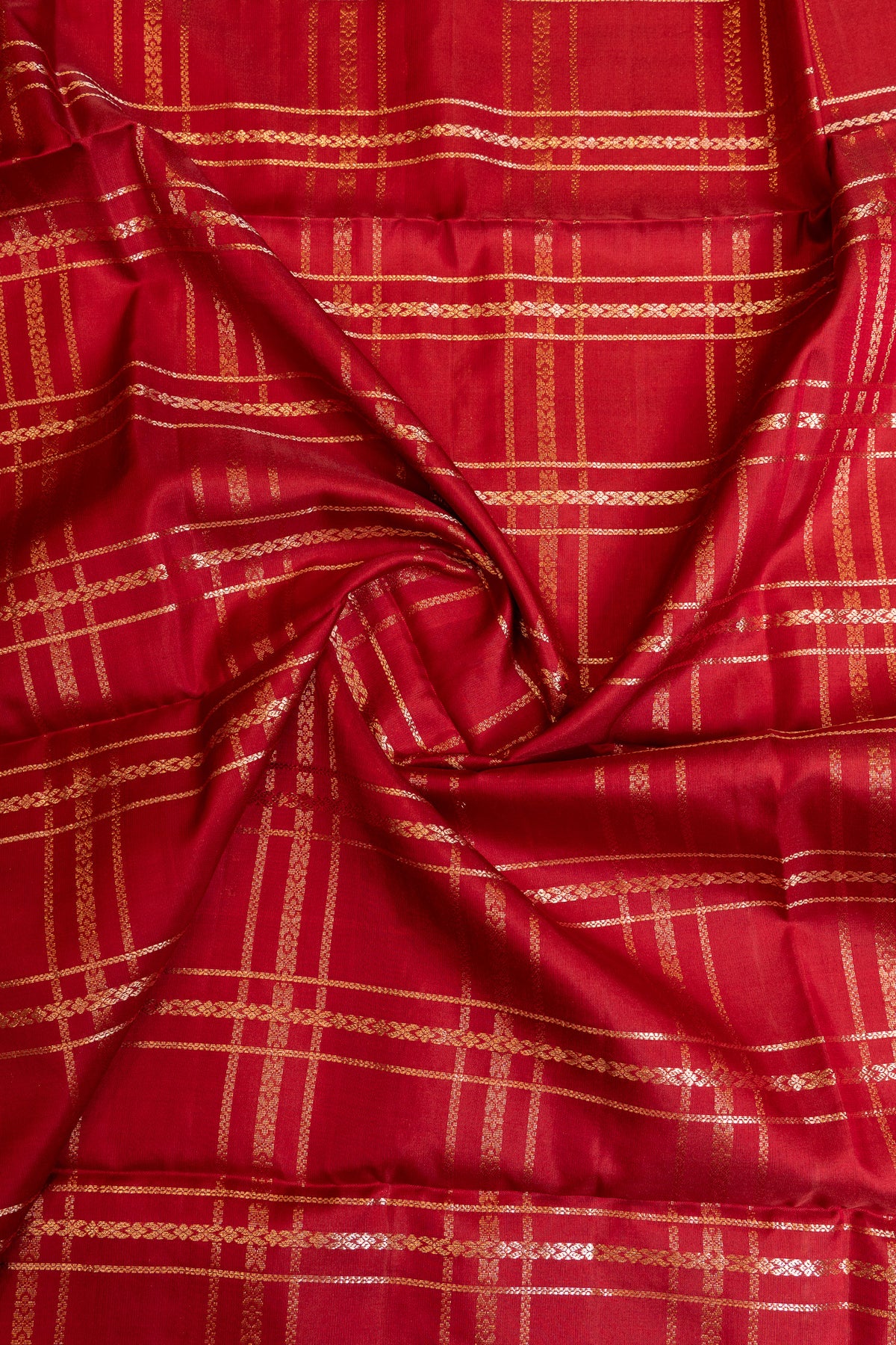 Experience timeless elegance with this Red Ornamental Zari Checks Pure Kanchipuram Silk Saree. Crafted from luxurious Kanchipuram silk, it features intricate zari check patterns that add a regal sparkle. Perfect for special occasions, this saree drapes beautifully, enhancing your grace and making a refined statement of traditional artistry.