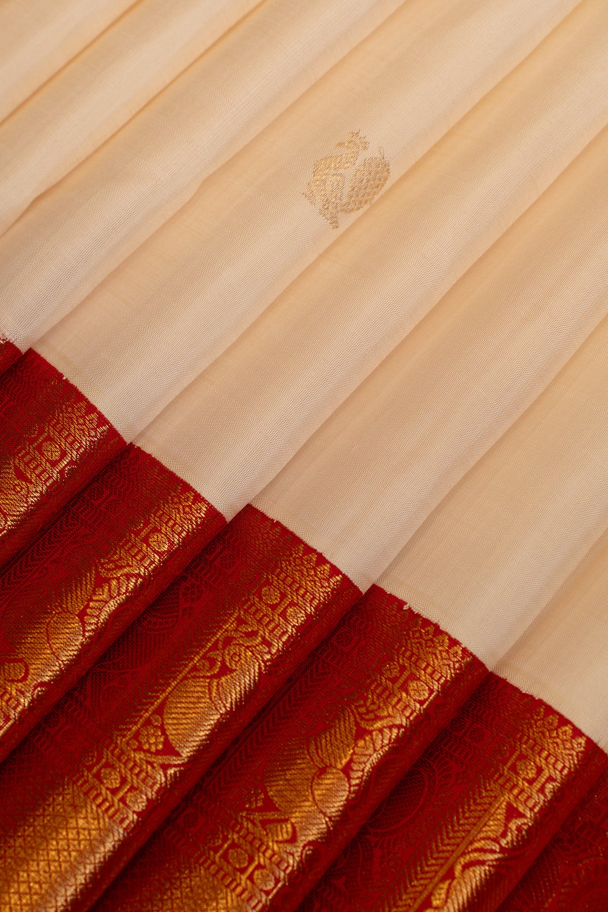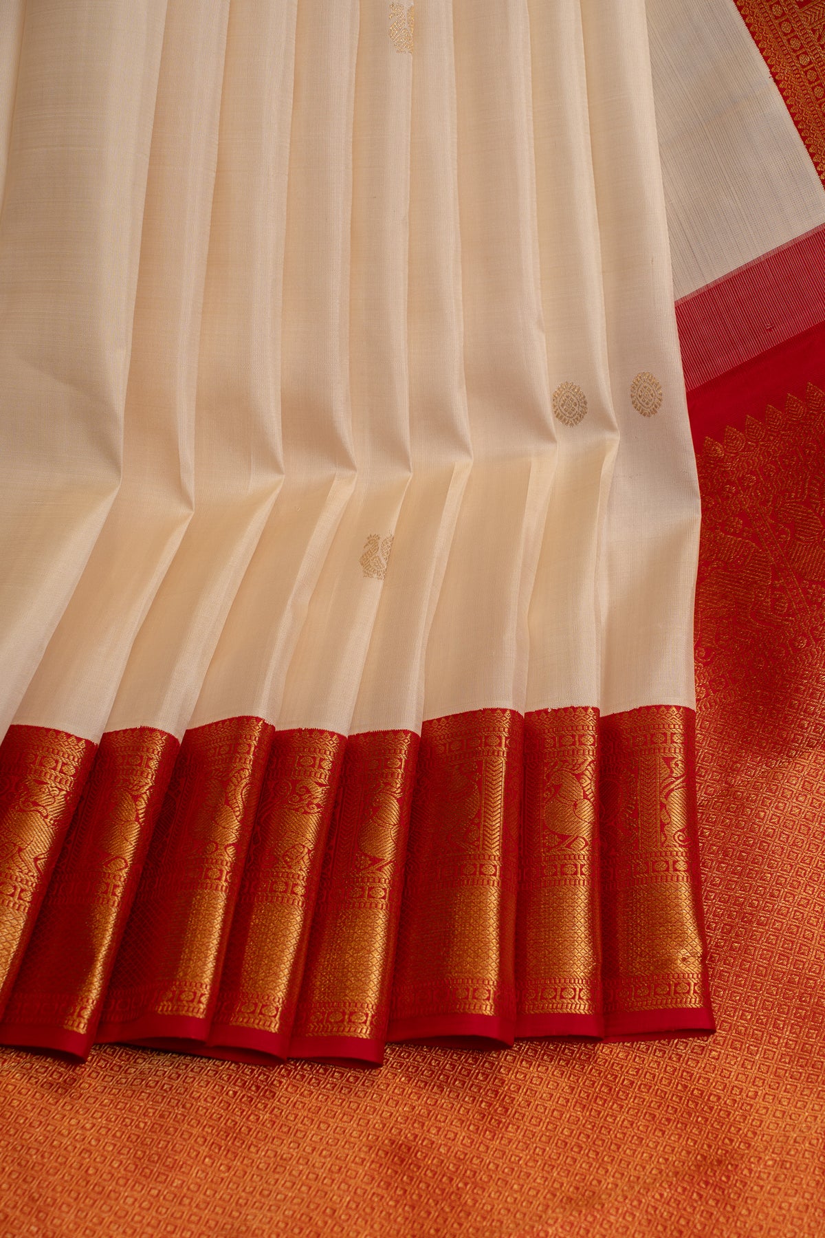 Celebrate tradition with this Pearl White and Red Pure Kanchipuram Silk Saree. Crafted from premium silk, the serene pearl white base is beautifully contrasted by rich red accents, evoking timeless elegance. Its exquisite weaving and classic color combination make it an ideal choice for refined occasions, embodying grace and heritage with sophistication.