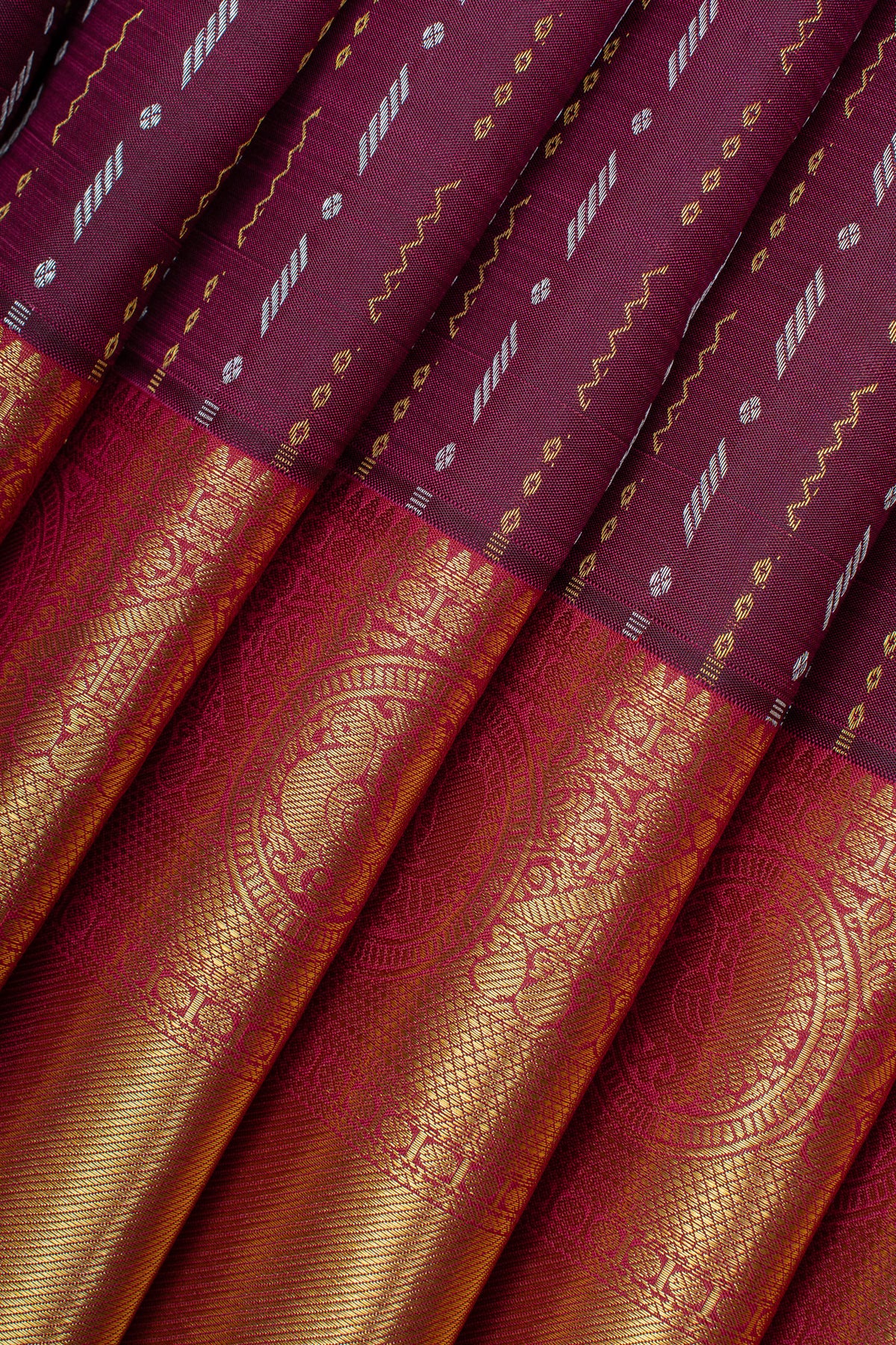 Make a vibrant statement with this purple and red stripes pure Kanchipuram silk saree. The rich purple base is beautifully accented with striking red stripes, creating a bold and elegant look that reflects traditional South Indian craftsmanship.Woven from luxurious pure Kanchipuram silk, this saree features a smooth texture, lustrous finish, and graceful drape. Perfect for weddings, festive occasions, and grand celebrations, it highlights the artistry of skilled weavers.