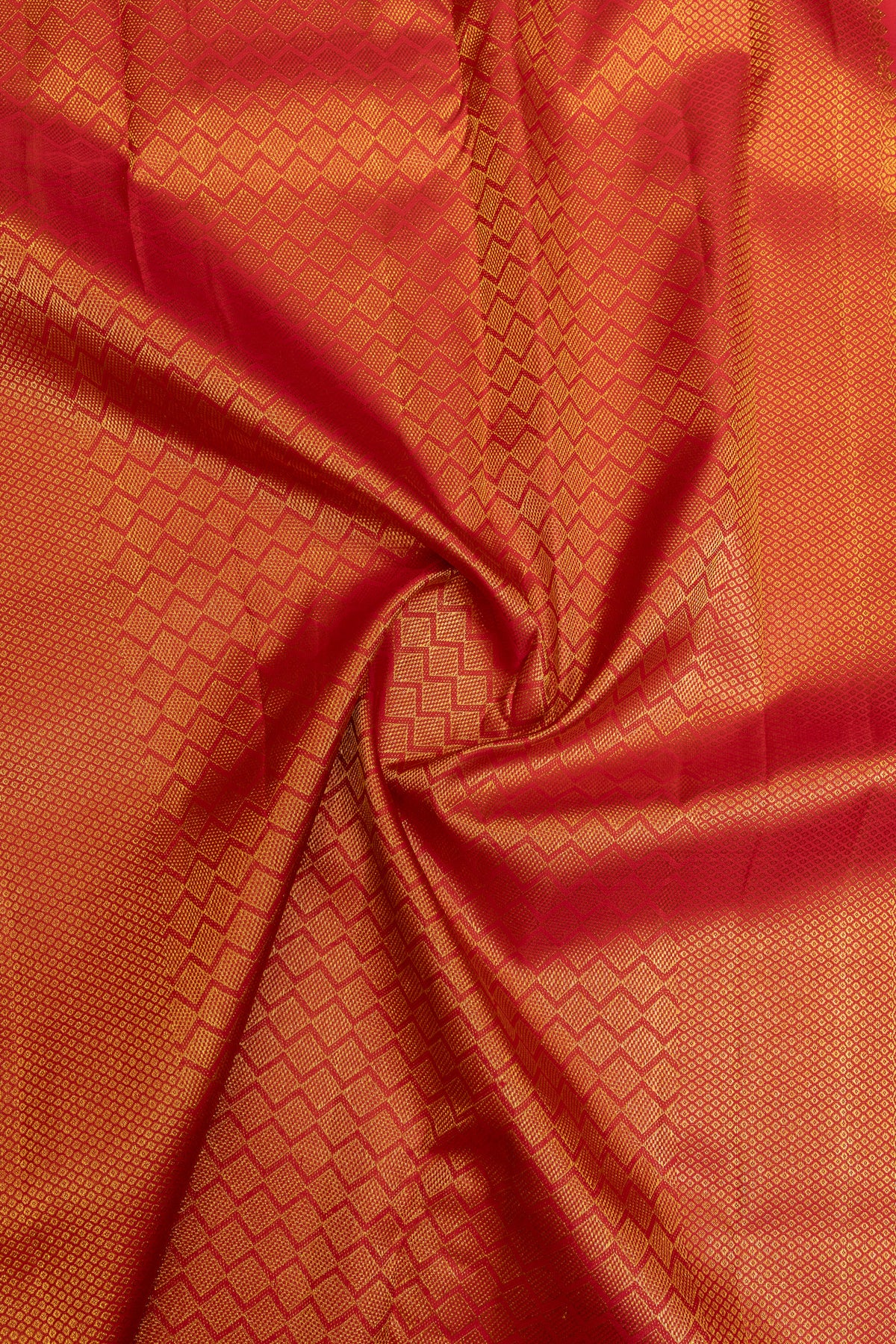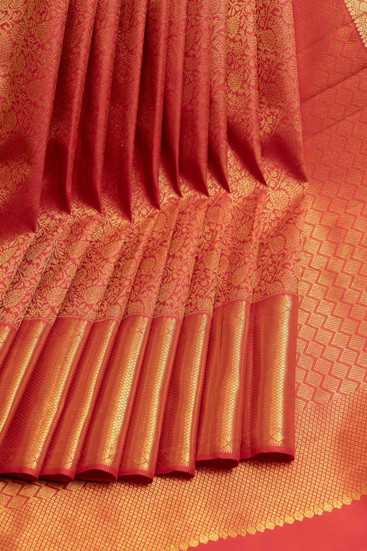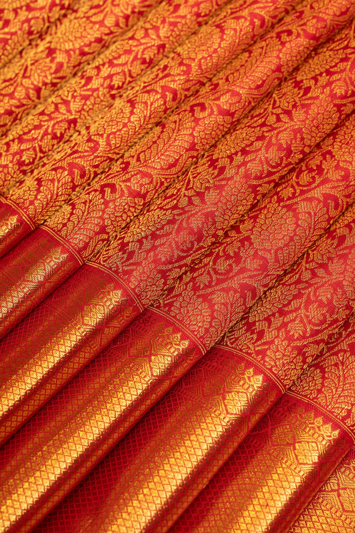 This bridal red Kanchipuram silk saree commands attention with its opulent floral brocade work, a hallmark of South Indian weaving mastery. Crafted from pure silk, the fabric drapes with luxurious fluidity while the intricate brocade patterns shimmer with gold and metallic threads, creating an ethereal radiance. The deep crimson base evokes tradition and celebration, making it an ideal choice for weddings and momentous occasions. Every motif is meticulously woven to ensure lasting beauty and authenticity. A timeless heirloom piece that celebrates craftsmanship and cultural heritage.