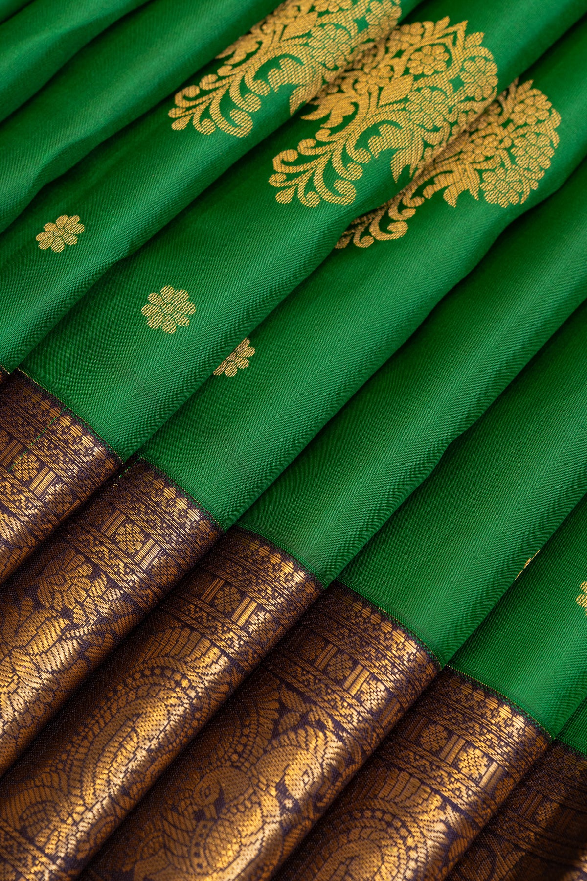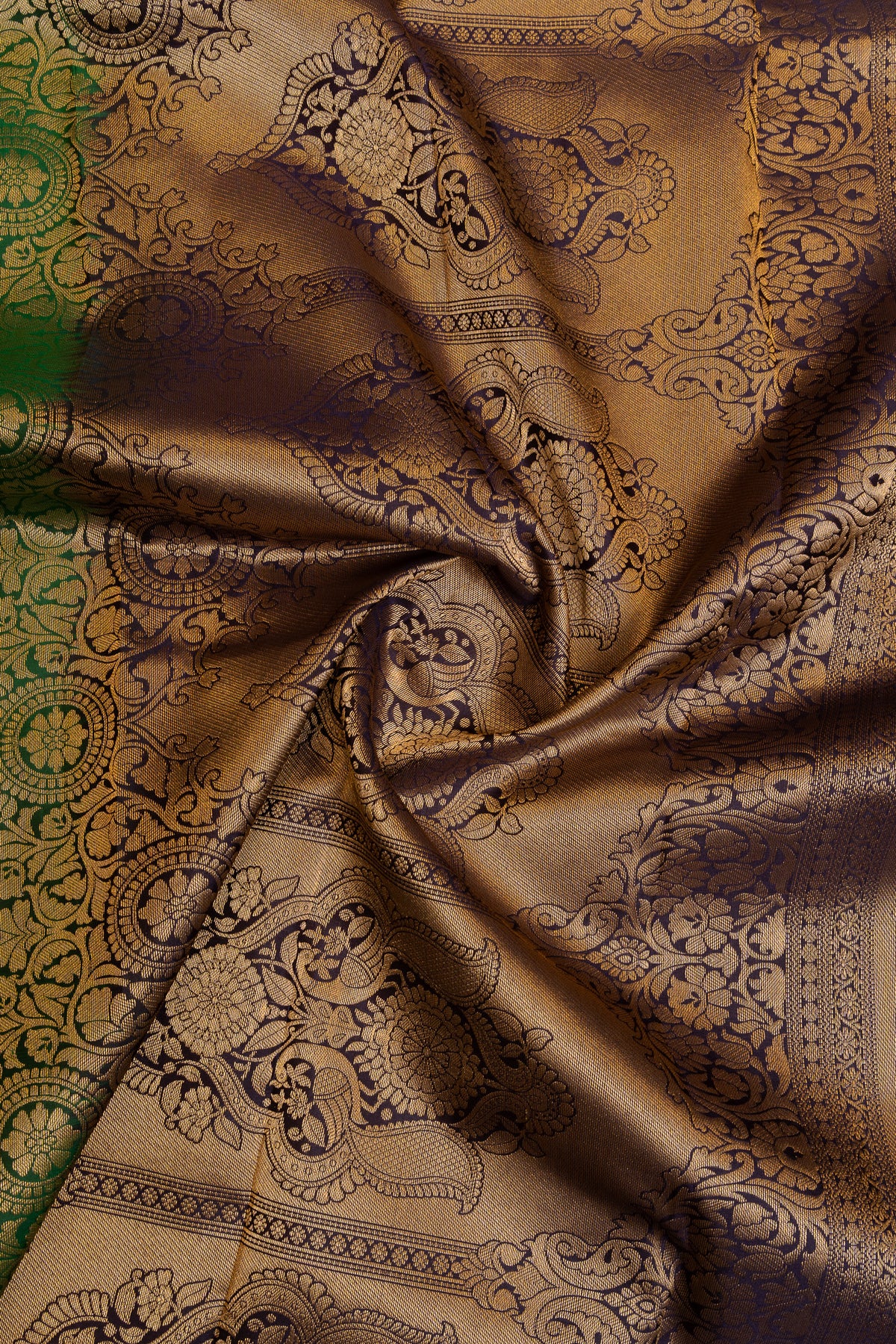 Experience the captivating blend of green and purple in this exquisite Kanchipuram silk saree, a harmonious fusion of traditional aesthetics and refined elegance. Woven from pure silk using time-honored techniques, this saree showcases the masterful craftsmanship Kanchipuram is renowned for, with a luxurious drape and radiant finish. The striking color combination creates a distinctive presence, perfect for those seeking a sophisticated statement piece for weddings, festivals, and special occasions. Celebrate heritage and grace with this authentic South Indian treasure.