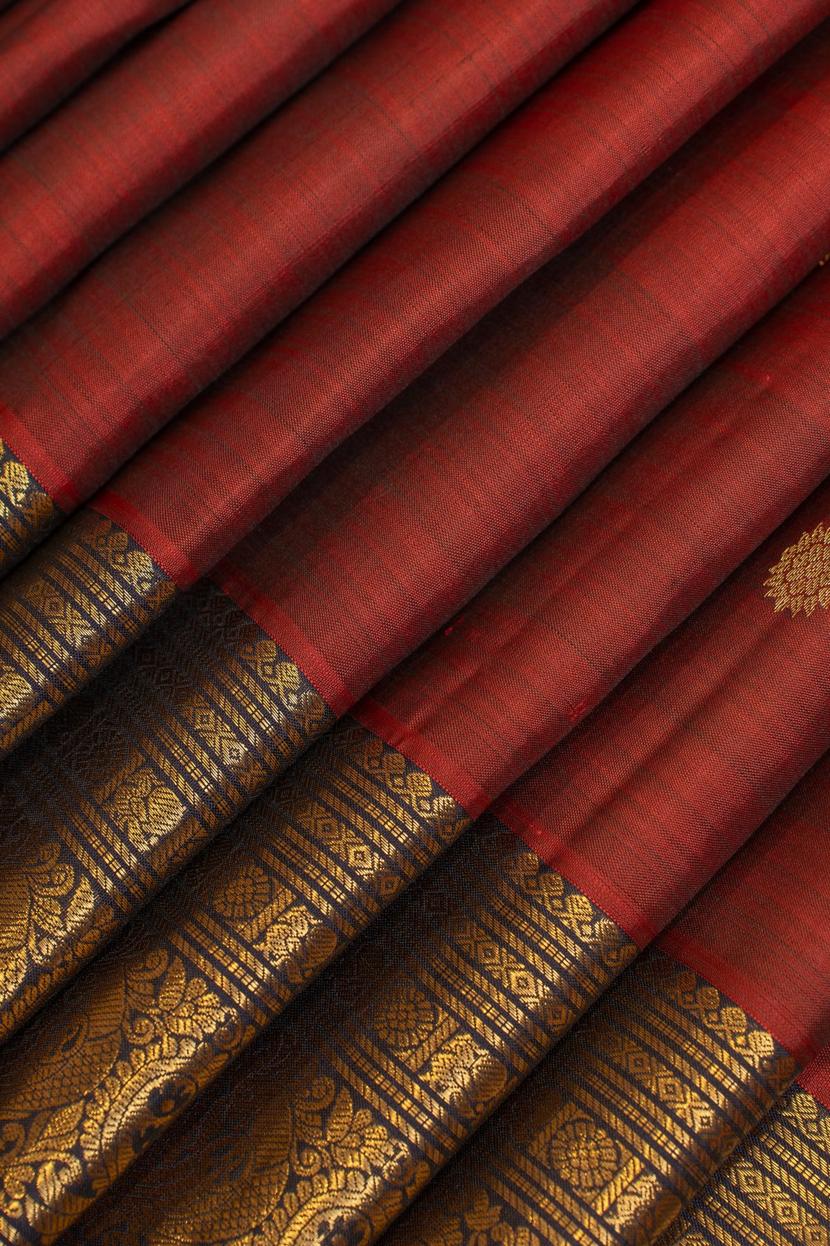 This maroon and blue traditional pure Kanchipuram silk saree showcases elegant craftsmanship with a rich, lustrous finish. Crafted from premium silk, its vibrant colors and classic design create a sophisticated look perfect for weddings and special occasions. The harmonious blend of maroon and blue adds depth and grace, celebrating heritage with timeless style.