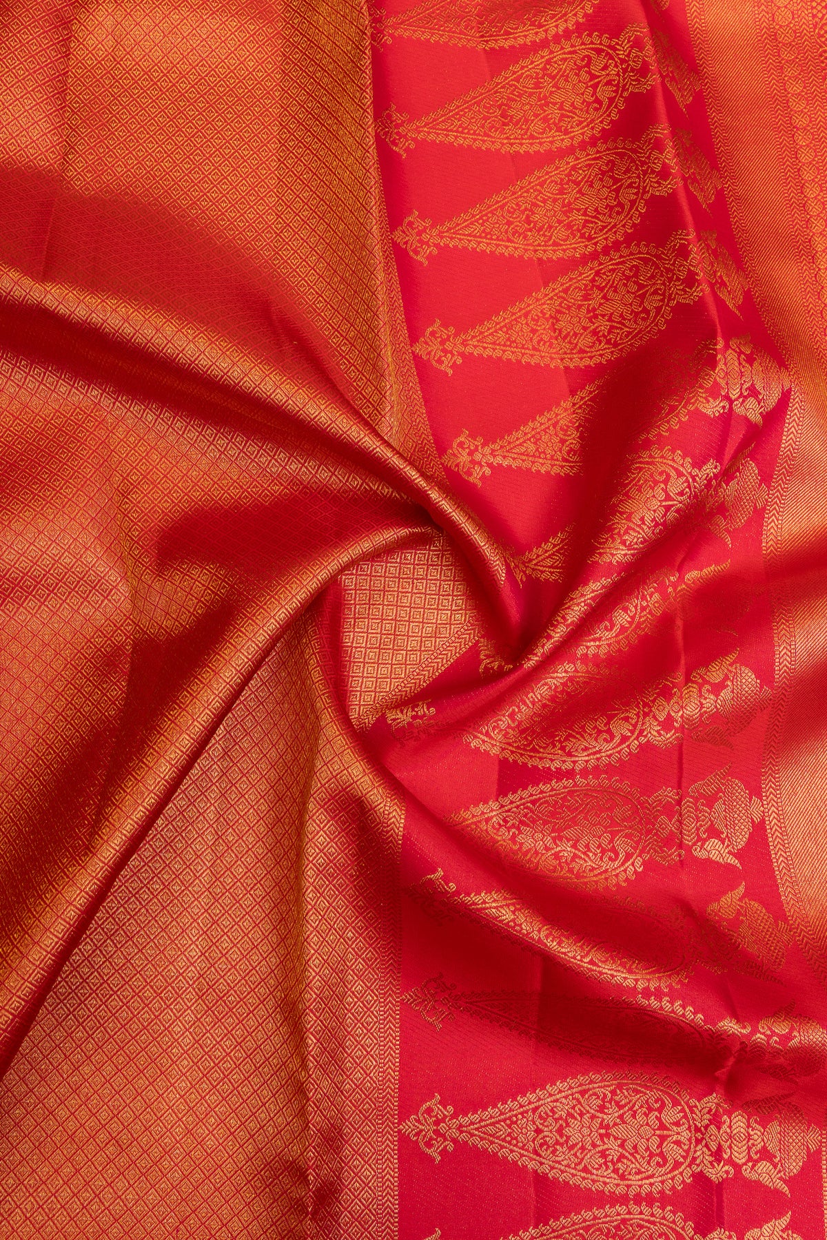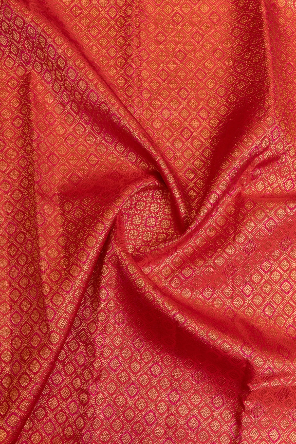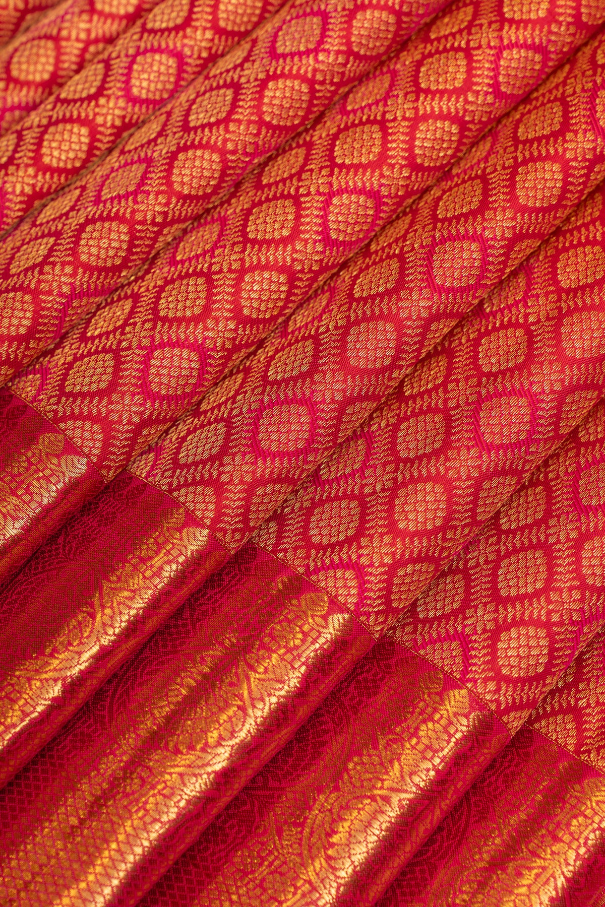 Radiate understated sophistication in this peach diamond brocade Kanchipuram silk saree, a luminous choice for the modern traditionalist. Woven from premium pure silk, this saree features geometric diamond brocade patterns that create an elegant interplay of light and shadow across the fabric. The warm peach tone conveys both approachability and refinement, making it versatile for various occasions from intimate gatherings to grand celebrations. The precise diamond motifs showcase the exceptional skill of master weavers, reflecting centuries of Kanchipuram textile heritage. The authentic silk composition ensures a luxurious feel and impeccable drape that enhances your natural grace. This saree seamlessly bridges classic tradition with contemporary sensibility, offering a timeless investment piece for those who appreciate nuanced beauty and genuine craftsmanship.