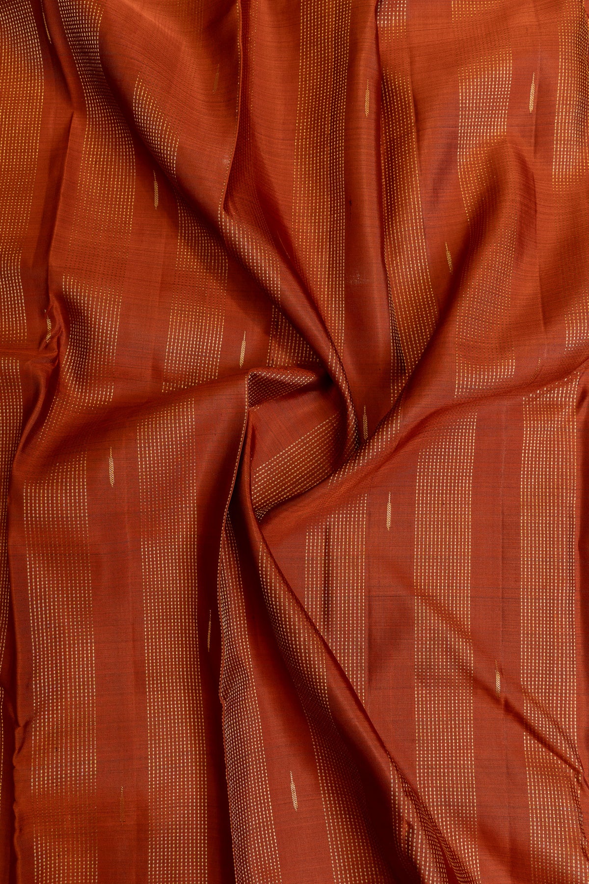 Experience timeless elegance with this Rus orange zari panel pure Kanchipuram silk saree. Crafted from rich silk, it features intricate zari work that adds a subtle shimmer, perfect for special occasions. The vibrant rus orange hue enhances its sophisticated appeal, while the traditional craftsmanship ensures lasting beauty and grace. Ideal for celebrations, this saree reflects heritage and refined style effortlessly.