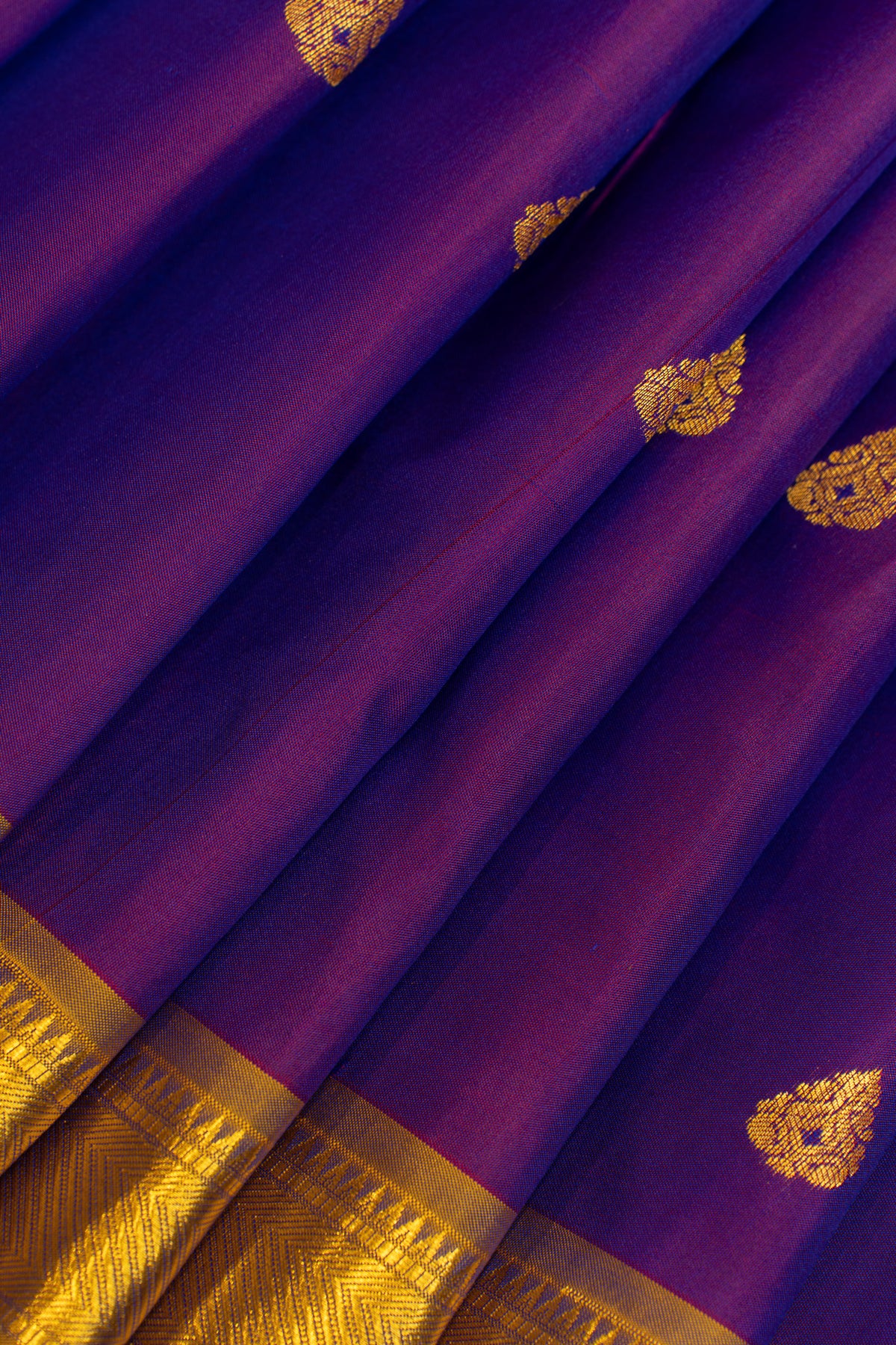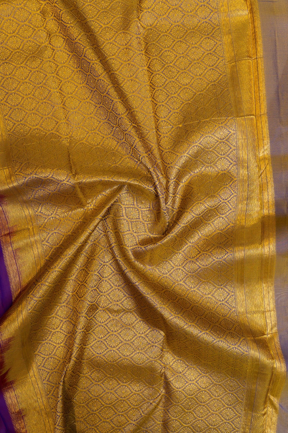 Elevate your elegance with this exquisite purple and mustard pure Kanchipuram silk saree. Crafted from premium silk, it showcases rich hues and traditional craftsmanship, perfect for special occasions. The luxurious texture and vibrant colors ensure a timeless appeal, making it a sophisticated addition to your wardrobe.