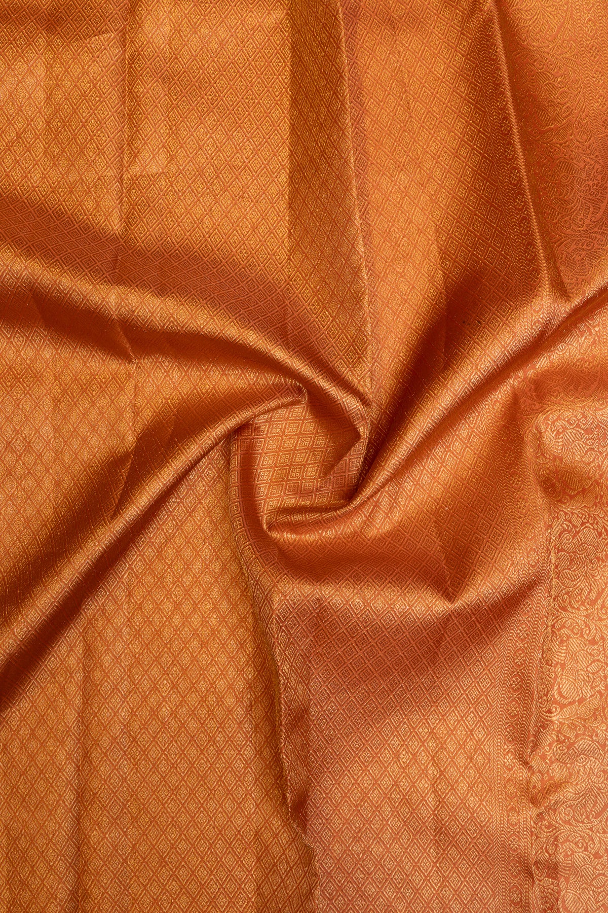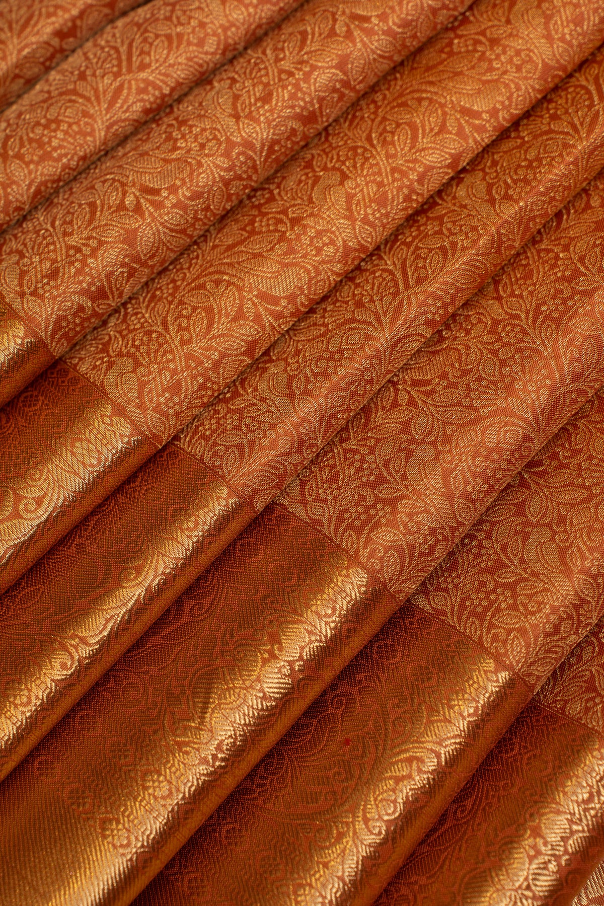 Experience the allure of tradition with this rust orange floral brocade pure Kanchipuram silk saree. Expertly woven from premium silk, its intricate floral brocade design enhances the rich, warm hue, creating a captivating fusion of color and texture. Ideal for festive celebrations and formal events, this saree offers a sophisticated statement that reflects timeless craftsmanship and elegance.