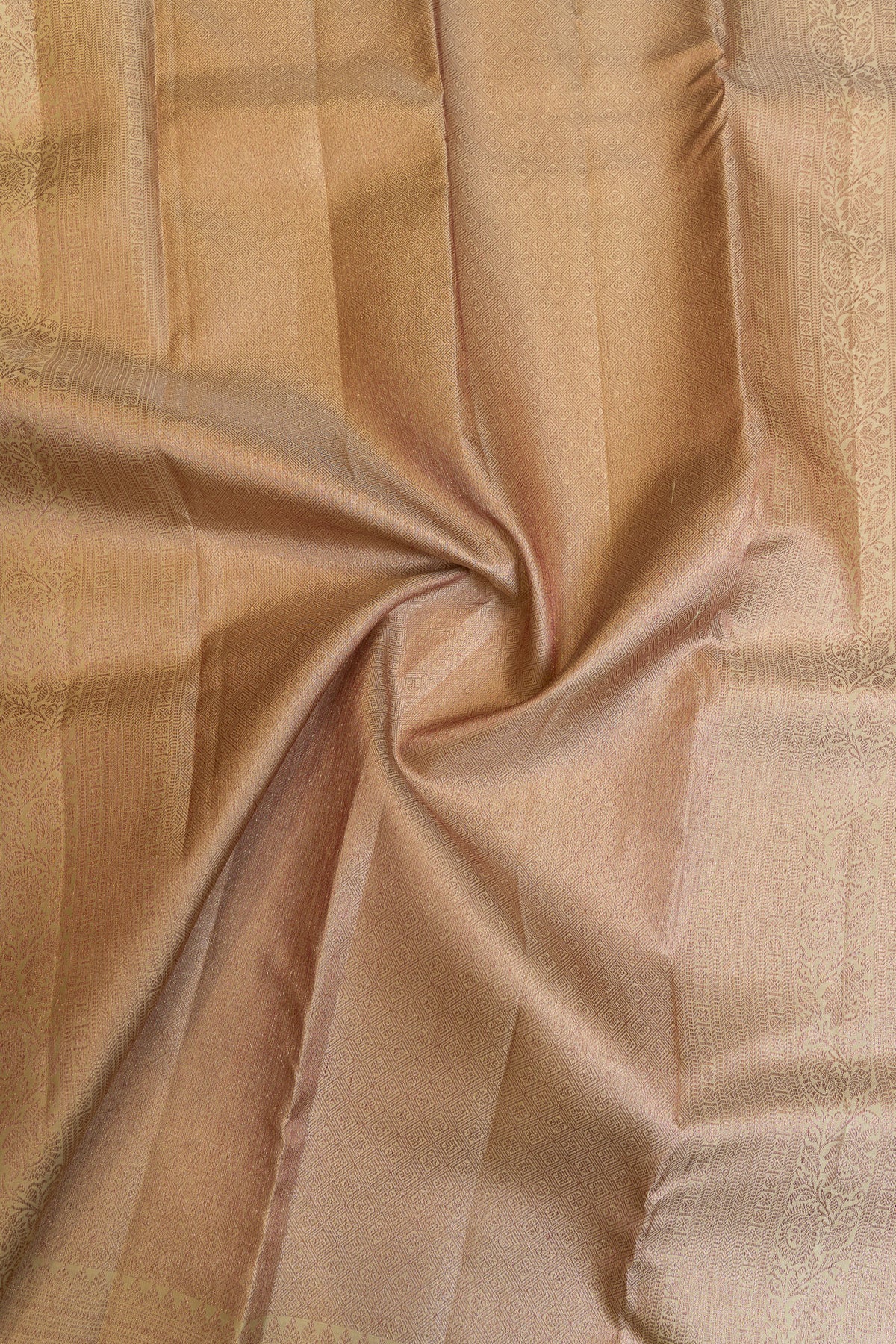 This mint green pure Kanchipuram silk saree features an elegant turning border adorned with intricate brocade work. Crafted from luxurious silk, its fresh hue combined with detailed craftsmanship offers a serene yet sophisticated look, perfect for refined occasions and celebrations.