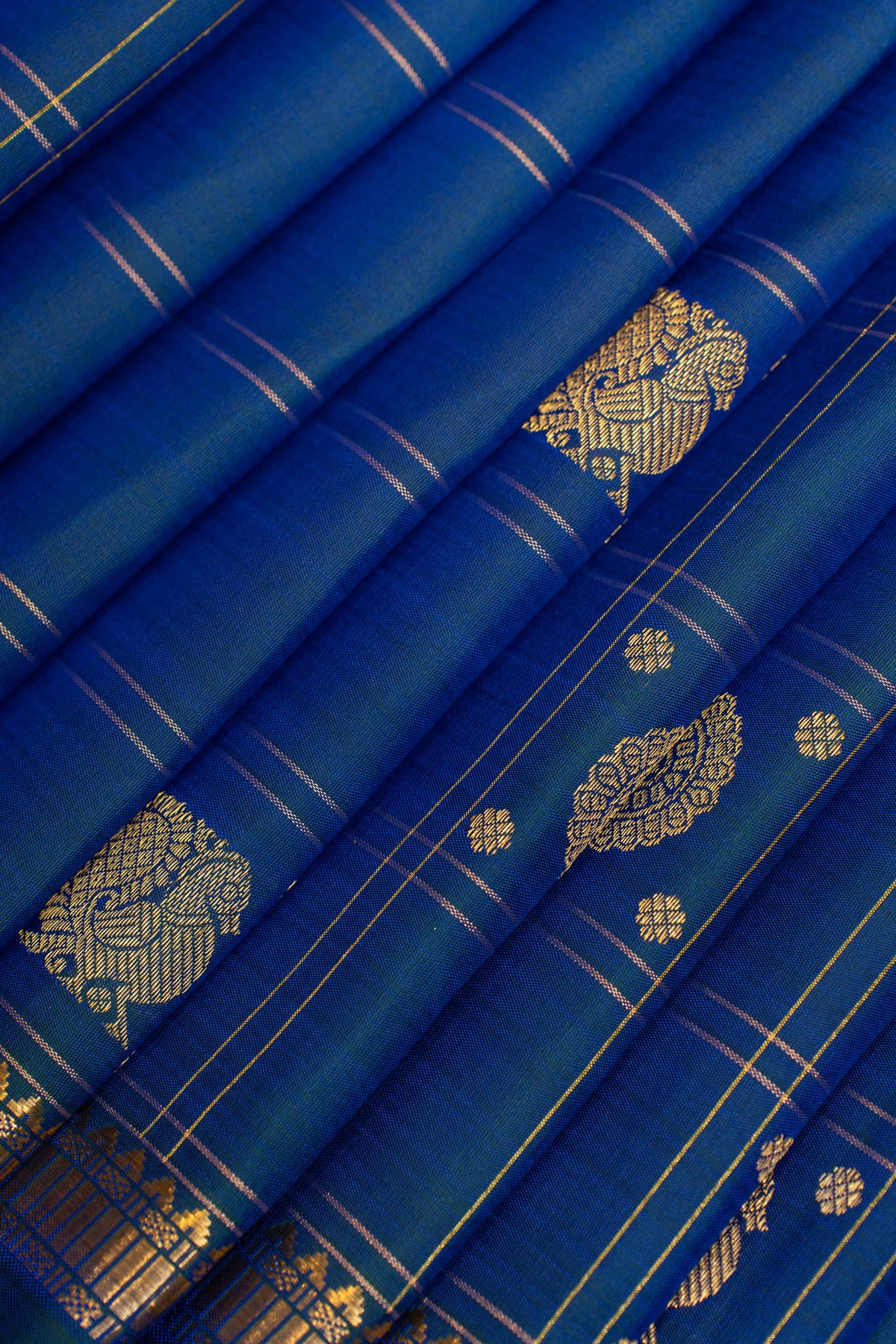 Embrace understated luxury with this peacock blue Kanchipuram silk saree, distinguished by its delicate small border detailing. Woven entirely from pure silk, this saree captures the essence of classical South Indian textile artistry with refined restraint. The deep peacock blue creates a versatile canvas that transitions seamlessly from daytime elegance to evening grandeur, while the intricate small border adds a subtle flourish of craftsmanship. The inherent sheen and weight of authentic Kanchipuram silk ensure a sophisticated drape that complements various body types. Perfect for those who appreciate minimalist design paired with maximum quality, this saree is an investment in timeless style and authentic heritage weaving.