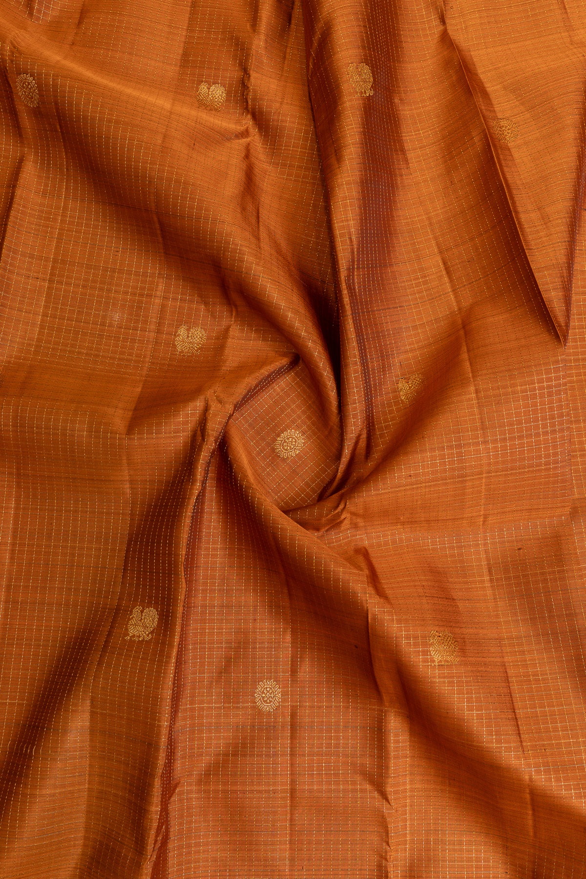 This rust orange pure Kanchipuram silk saree features elegant zari checks that add a refined shimmer to its rich texture. Crafted with traditional weaving techniques, it offers a graceful drape and lasting quality. Ideal for formal events, this saree is a timeless choice that reflects sophistication and heritage.