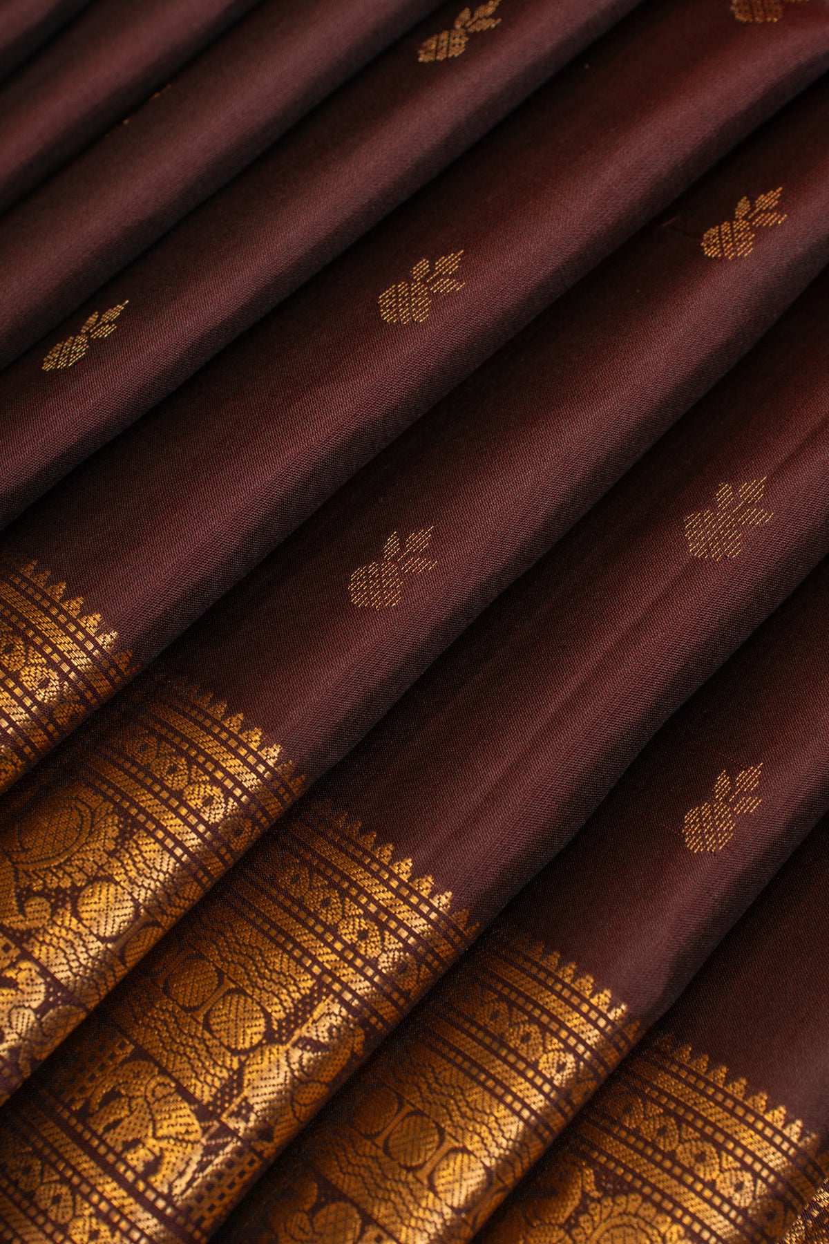 This pure soft silk saree in rich brown is beautifully highlighted with a gold zari border, blending traditional craftsmanship with elegant sophistication. Its smooth silk texture and refined drape make it a perfect choice for distinguished occasions, exuding timeless charm and grace.