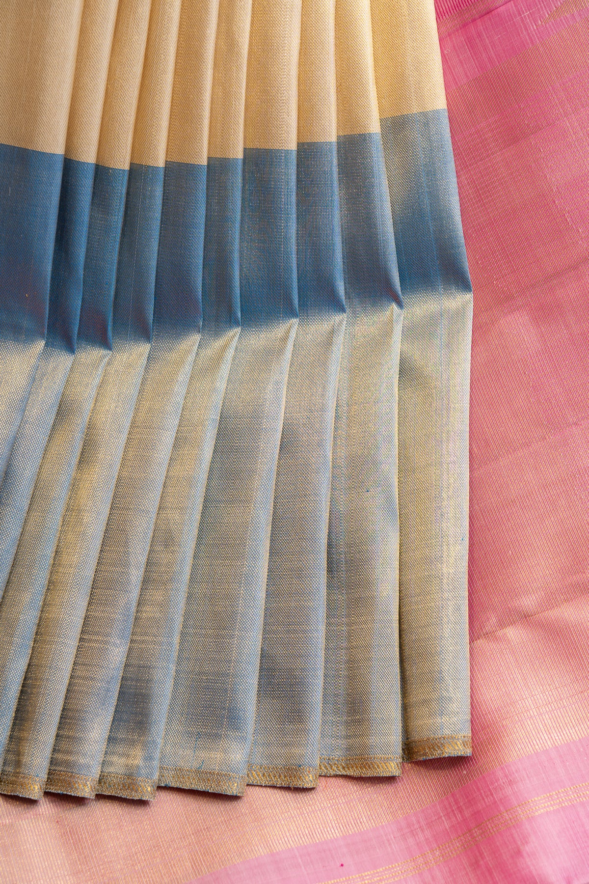 Discover understated luxury with this cream and blue Mupagam pure Kanchipuram silk saree, a refined creation that honors centuries of South Indian weaving tradition. Crafted from premium pure silk, this saree features the distinctive Mupagam weave—an intricate technique that creates subtle textural variations and visual richness. The serene combination of soft cream with cool blue tones offers a sophisticated palette that exudes calm elegance and timeless appeal. The natural luminosity of pure silk enhances both hues, creating a graceful drape that moves with effortless poise. Ideal for weddings, festivals, and formal occasions, this saree seamlessly bridges classical heritage with contemporary sensibility. An heirloom-quality piece that celebrates authentic Kanchipuram artistry, it remains a cherished investment for those who appreciate refined Indian textile mastery.