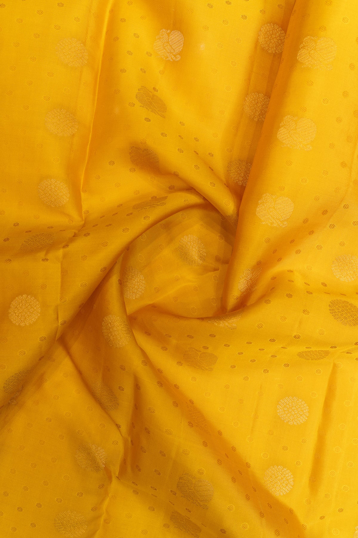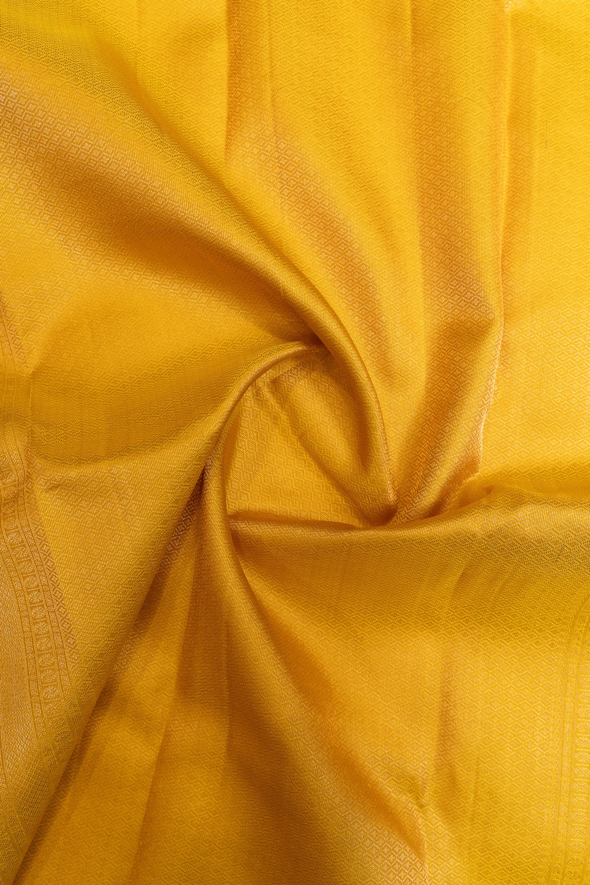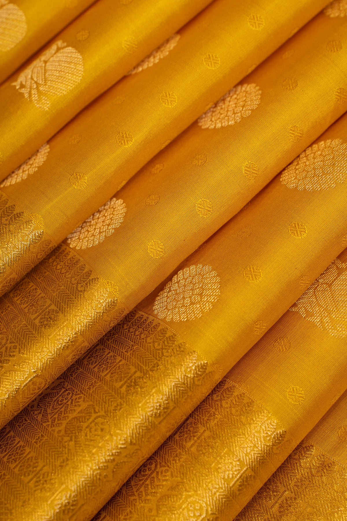 This golden yellow pure Kanchipuram silk saree radiates elegance with its rich, vibrant hue and lustrous silk texture. Crafted with meticulous attention to detail, it offers a graceful drape and a timeless appeal, making it an ideal choice for festive and formal occasions.
