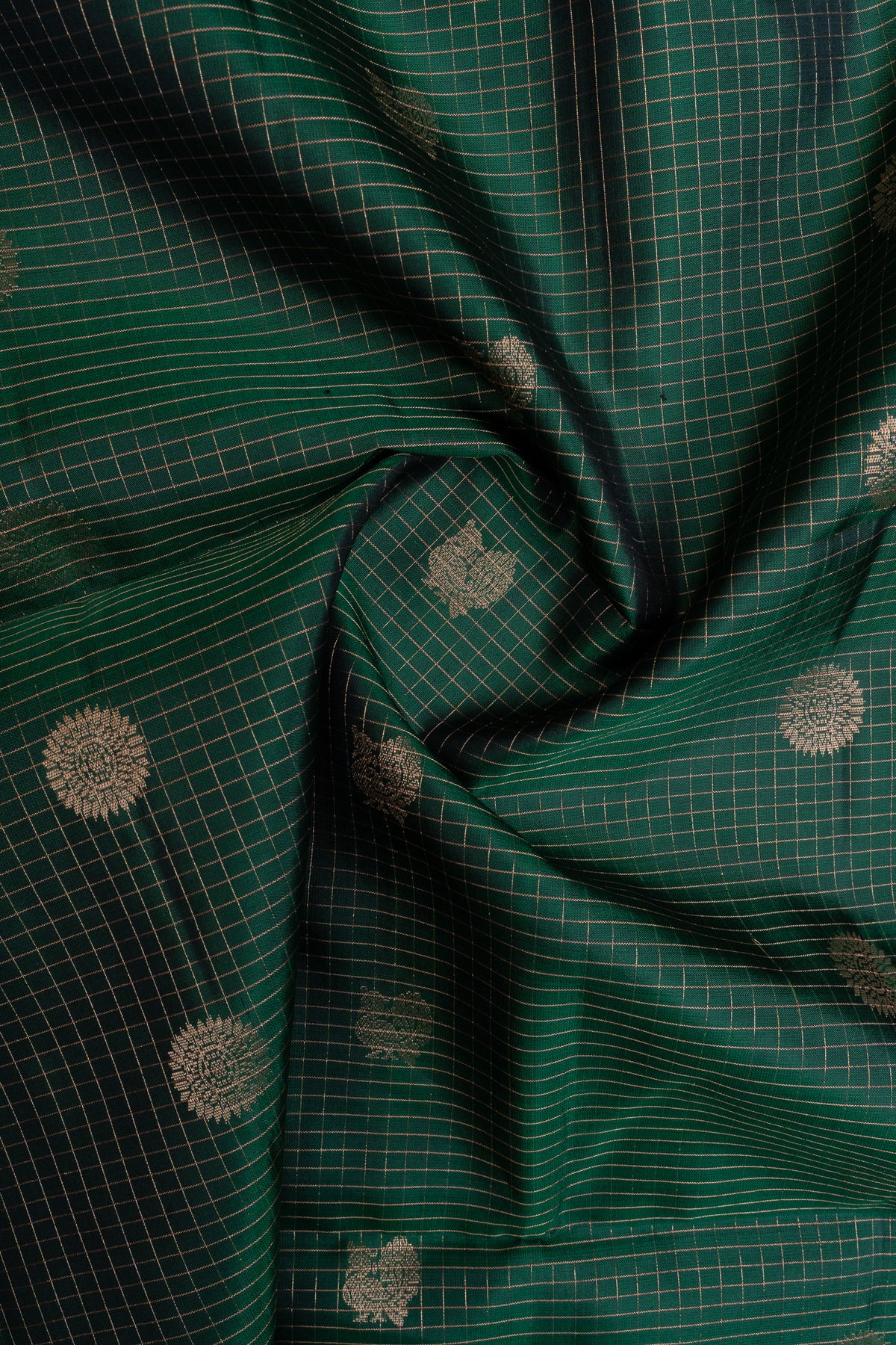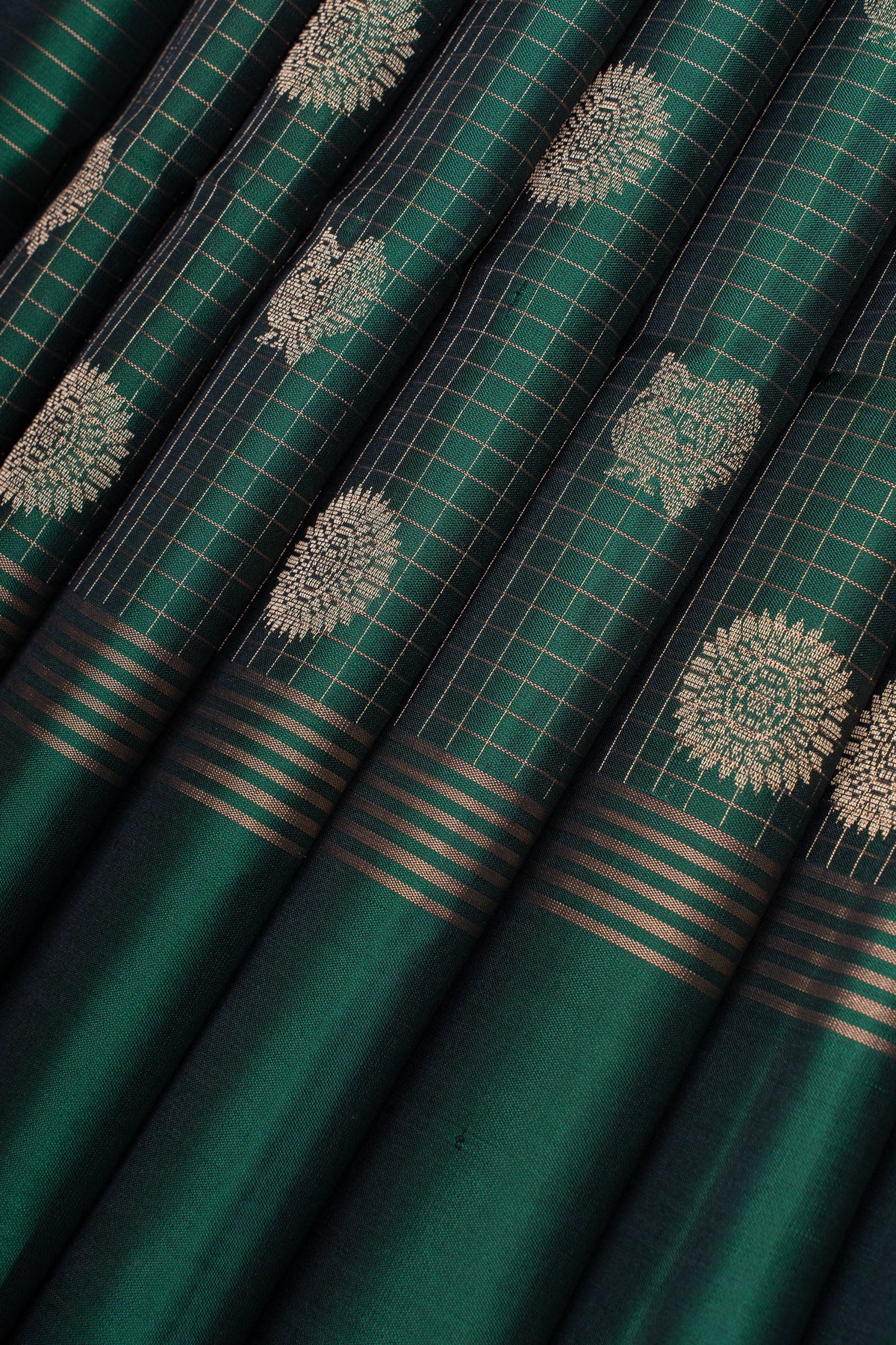 Celebrate timeless artistry with this green zari checks silk saree, where verdant elegance meets intricate embellishment. Crafted from pure, supremely soft silk, this saree features a distinctive checked pattern adorned with shimmering zari work that dances with light and movement. The serene green palette provides a calming yet sophisticated foundation, while the geometric precision of the checks adds contemporary dimension to traditional design. The zari detailing elevates the piece with refined opulence, showcasing generations of skilled craftsmanship and attention to detail. Versatile and graceful, this saree transitions effortlessly from festive celebrations to formal occasions, making it an essential investment for the discerning wearer. Drape yourself in this exquisite creation and experience the perfect balance of comfort, heritage, and understated luxury.