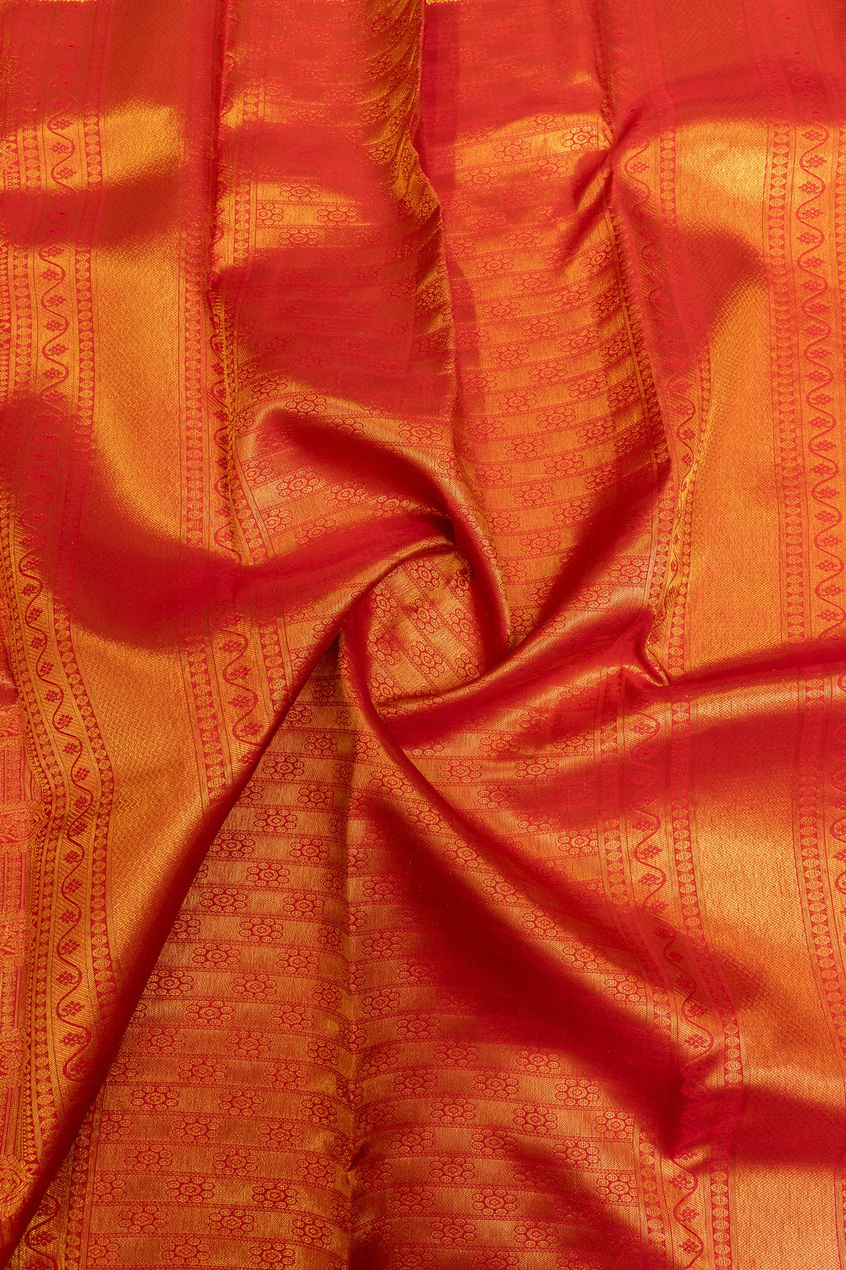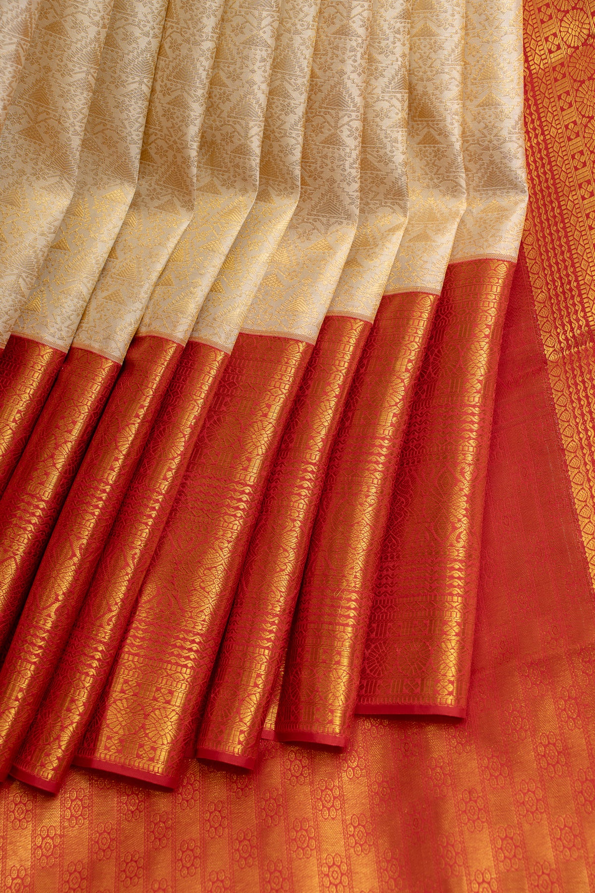 The Ivory and red brocade pure Kanchipuram silk saree exudes timeless elegance with its harmonious blend of soft ivory and vibrant red hues. Woven with intricate brocade patterns, this saree offers a rich texture and graceful drape, perfect for refined celebrations and distinguished events.