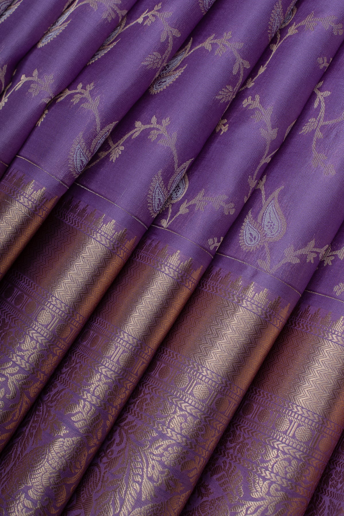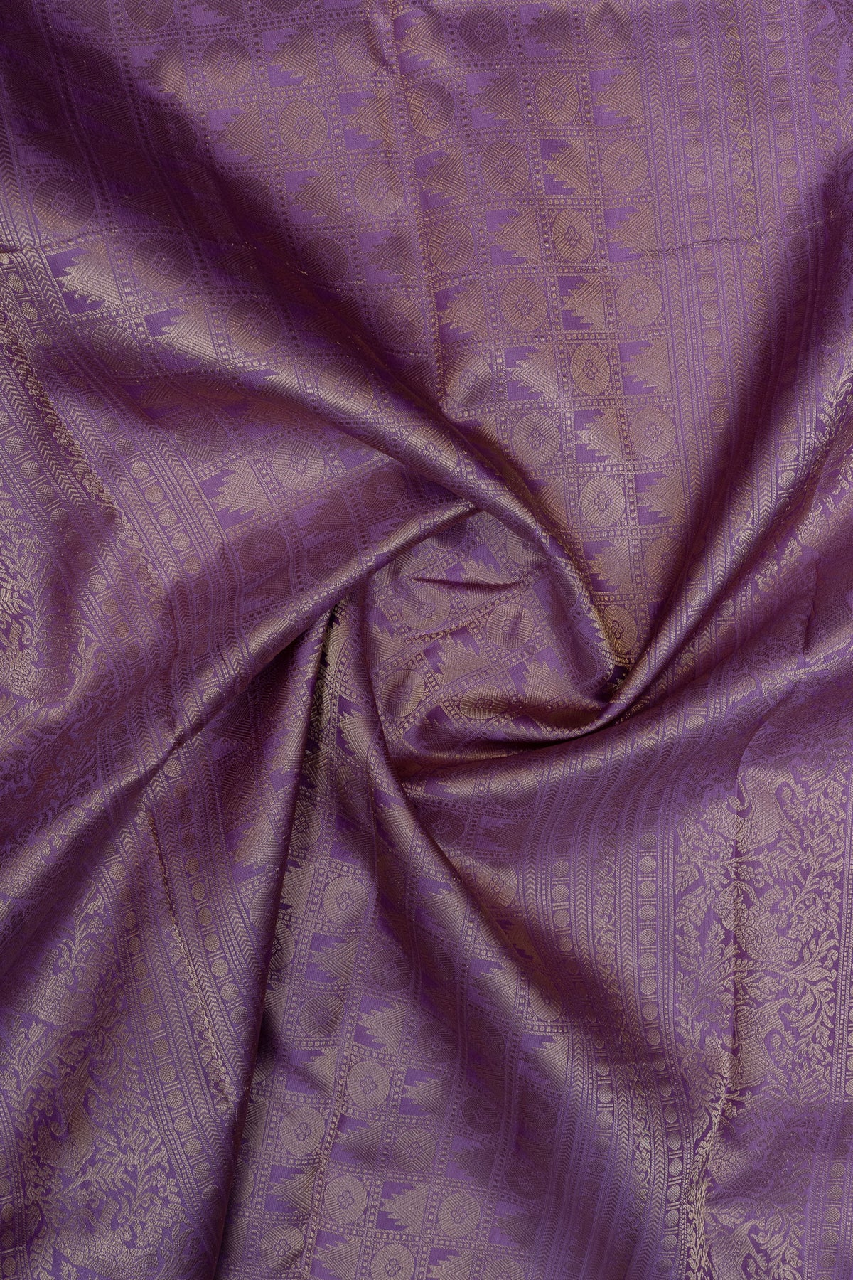 Elevate your wardrobe with this enchanting lilac brocade saree, crafted from pure Kanchipuram silk. The delicate lavender tone radiates understated elegance, while the intricate brocade weaving adds dimensional richness and textural sophistication. Each thread reflects generations of master craftsmanship, ensuring a garment that feels as luxurious as it appears. The natural silk drape creates a graceful silhouette, making it perfect for weddings, festivals, and refined occasions. A timeless investment piece that celebrates heritage artistry with contemporary sensibility.