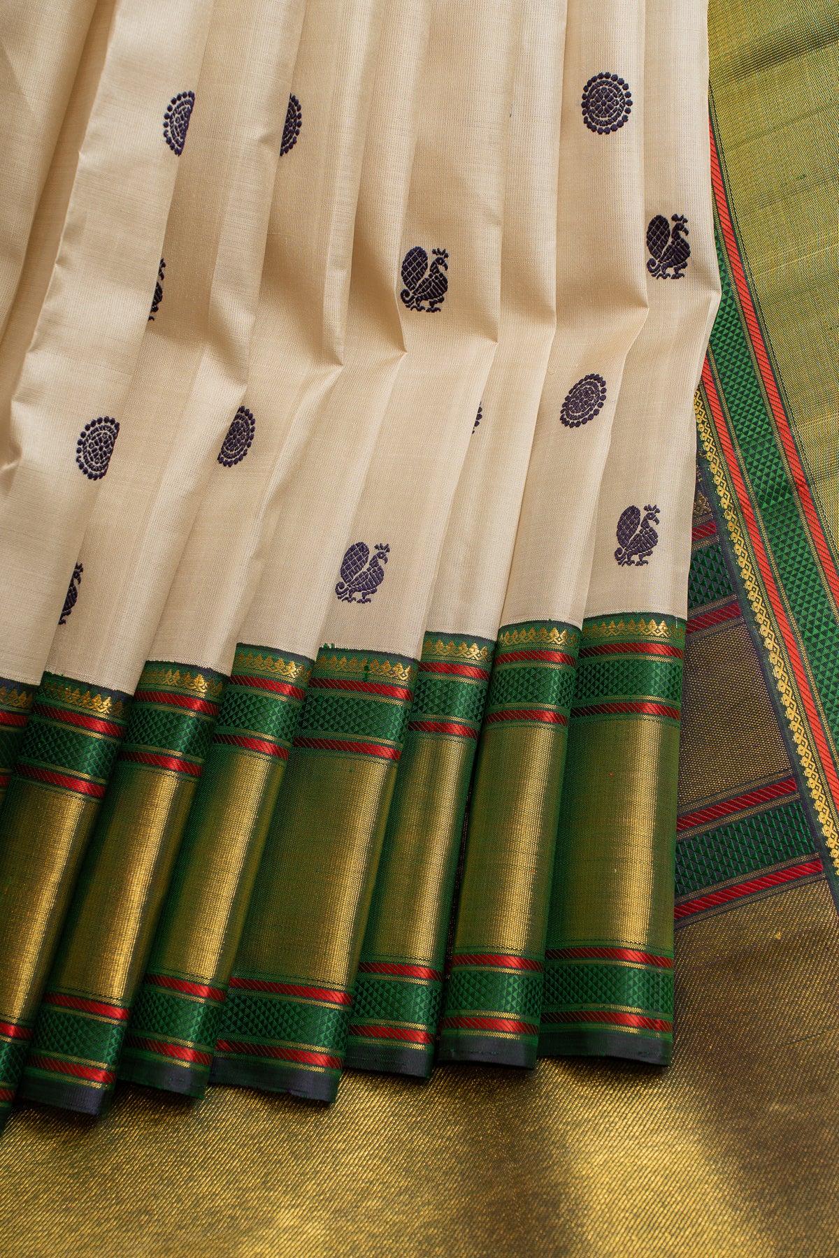 Off white and green thread motifs pure Kanchipuram silk saree