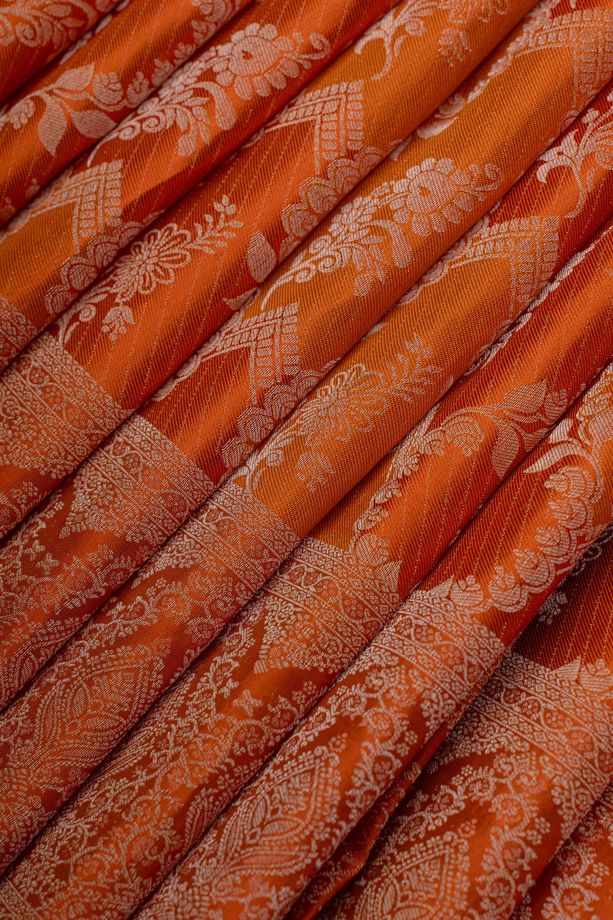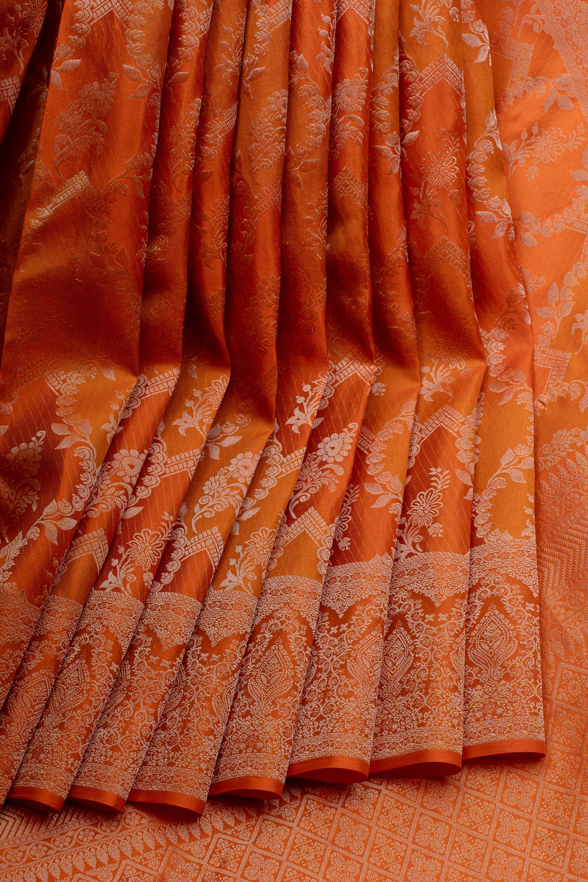 Celebrate vibrant sophistication with this stunning orange Kanchipuram silk saree, embellished with intricate brocade detailing. Spun from premium pure silk, this saree showcases the distinguished artistry of South Indian weaving through its meticulously crafted patterns and radiant finish. The warm orange hue exudes confidence and charm, making it an ideal selection for weddings, festive occasions, and special celebrations. The silk's natural sheen and fluid drape create a graceful silhouette that moves with effortless elegance. Rooted in the legendary weaving traditions of Kanchipuram, each thread reflects meticulous craftsmanship and artistic excellence. This saree represents an authentic piece of cultural heritage, offering timeless beauty and refined style for the discerning wearer.