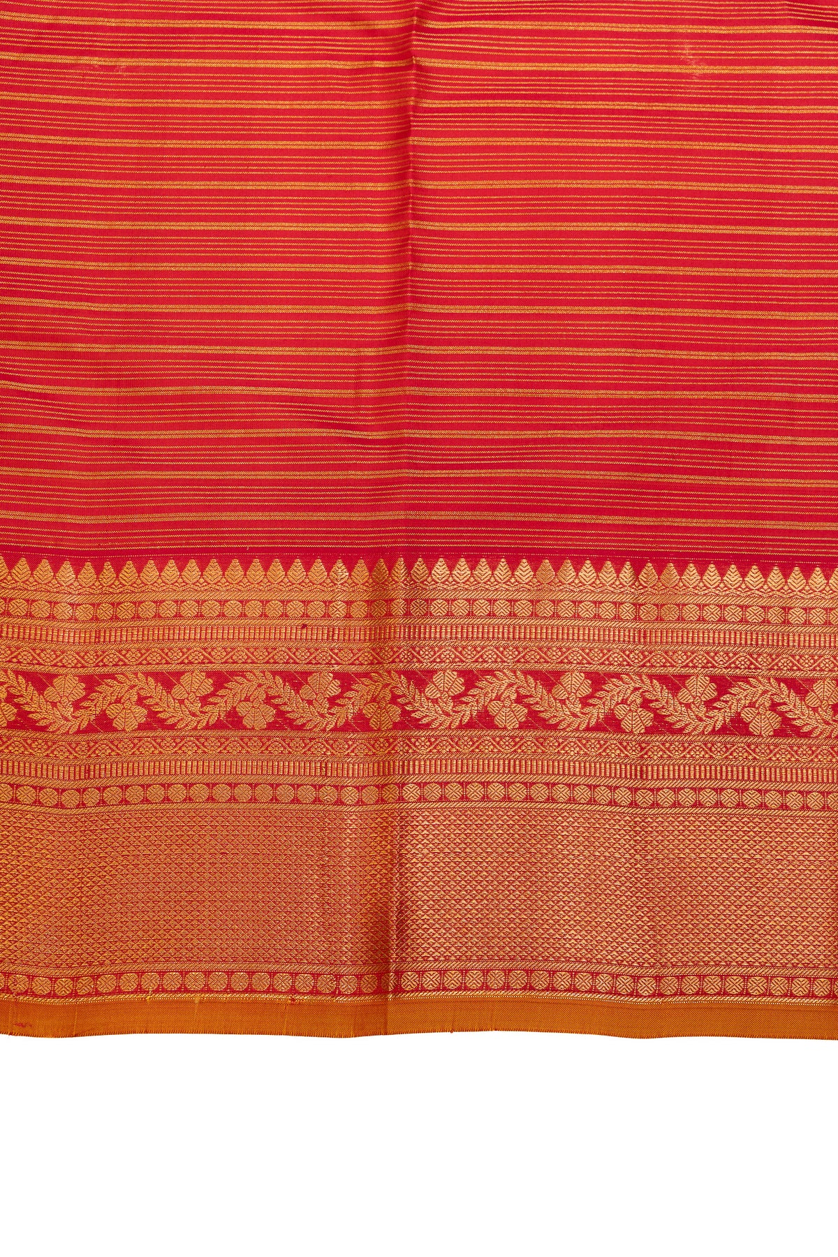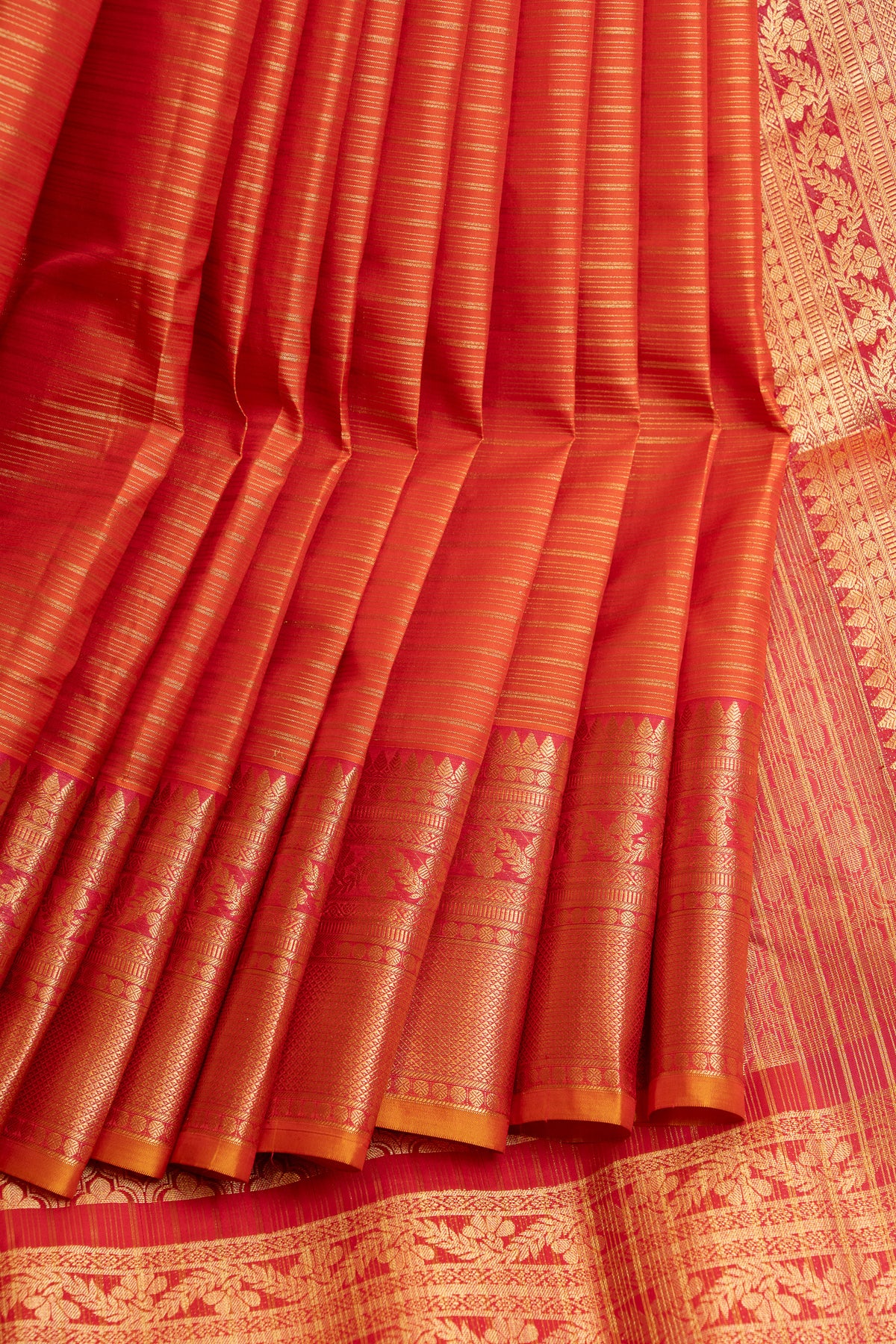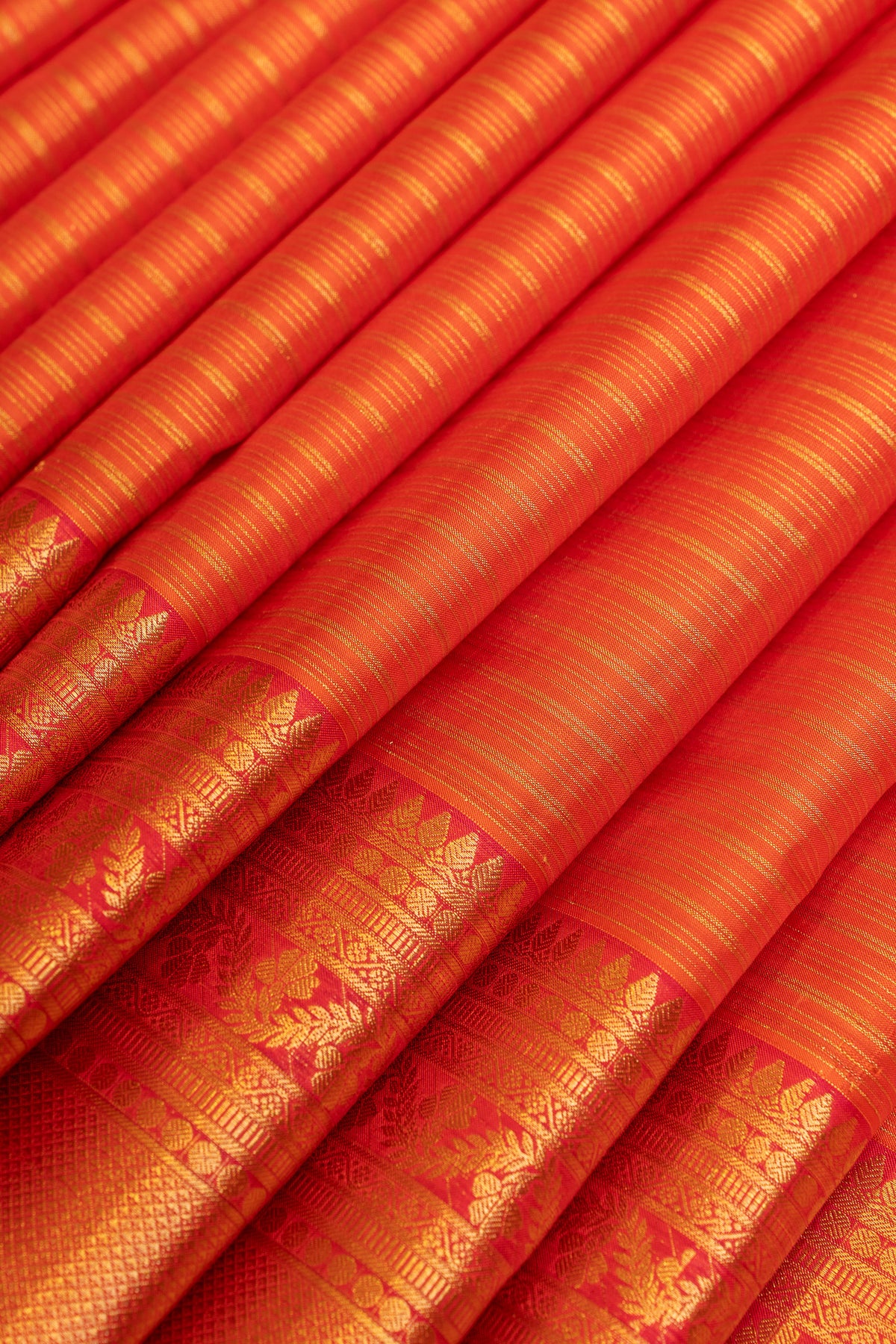 Elevate your ethnic wardrobe with this exquisite Kanchipuram silk saree, renowned for its lustrous weave and timeless appeal. The vibrant orange stripes create a striking visual rhythm across the fabric, offering versatility for both festive occasions and refined everyday wear. Crafted from pure silk, this saree drapes beautifully while maintaining its shape, ensuring comfort and elegance throughout the day. A quintessential piece that celebrates traditional South Indian craftsmanship with understated sophistication.