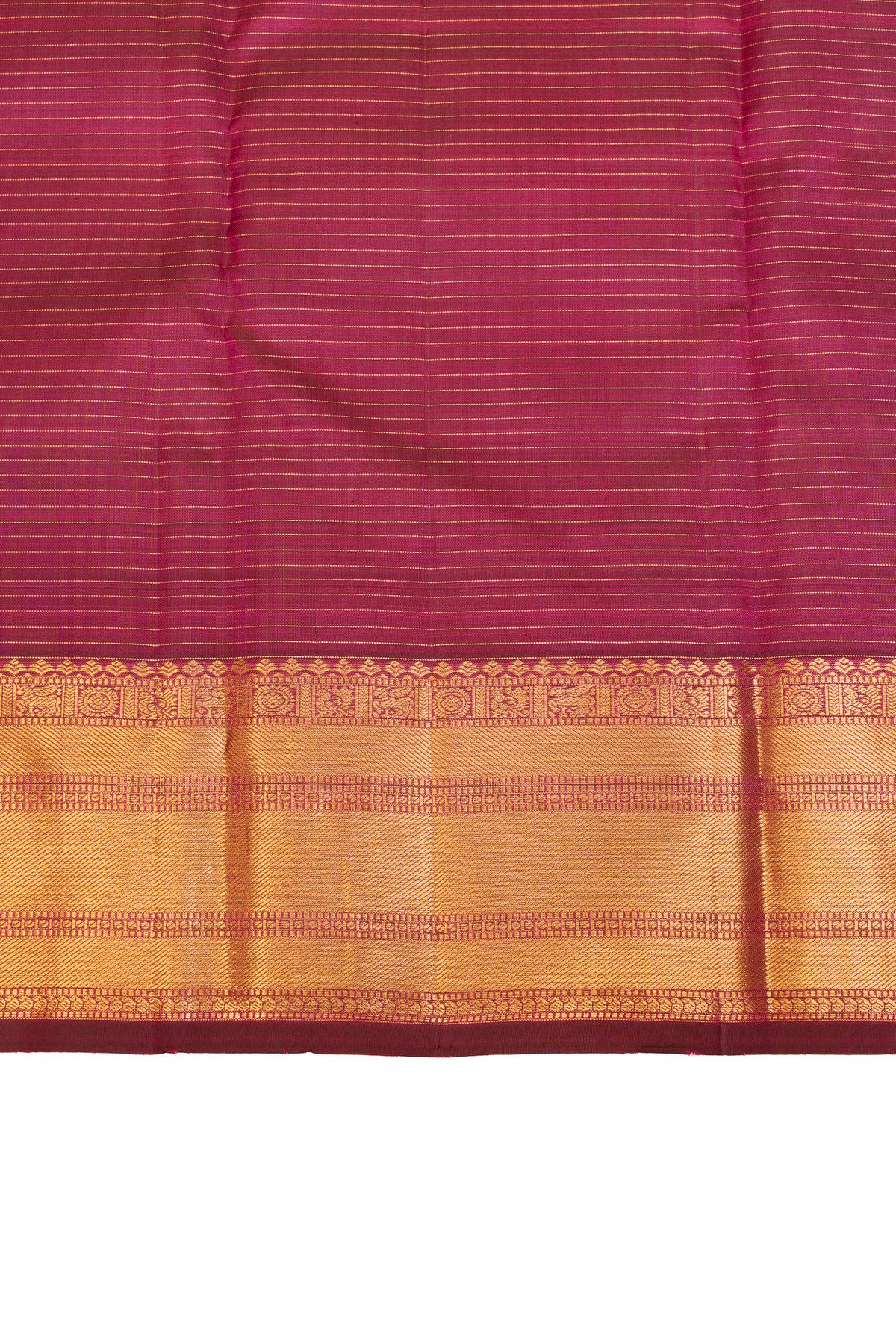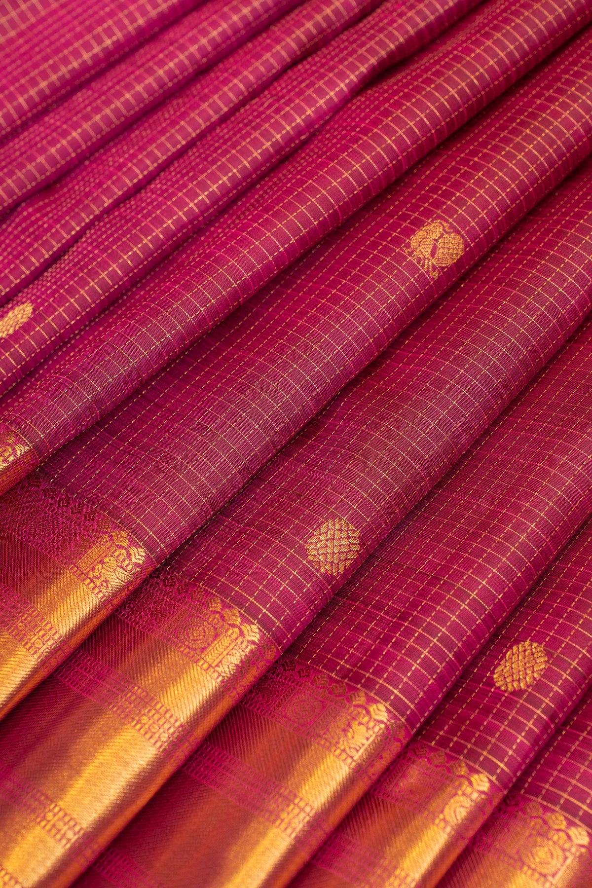 Elevate your collection with this stunning plum purple Zari checks pure Kanchipuram silk saree, where geometric precision meets luxurious craftsmanship. The rich plum purple canvas is embellished with intricate Zari (gold thread) checkered patterns that create a captivating interplay of light and shadow. Handwoven from premium Kanchipuram silk, this saree showcases the fabric's renowned resilience, luminosity, and graceful drape that connoisseurs admire. The geometric detailing adds contemporary visual interest while honoring centuries of traditional weaving heritage. Perfect for weddings, festive celebrations, and formal occasions, this saree commands attention with understated grandeur. Each meticulously crafted check reflects the expertise of master artisans dedicated to preserving authentic South Indian textile traditions. A truly distinguished investment piece that celebrates both heritage and timeless elegance.