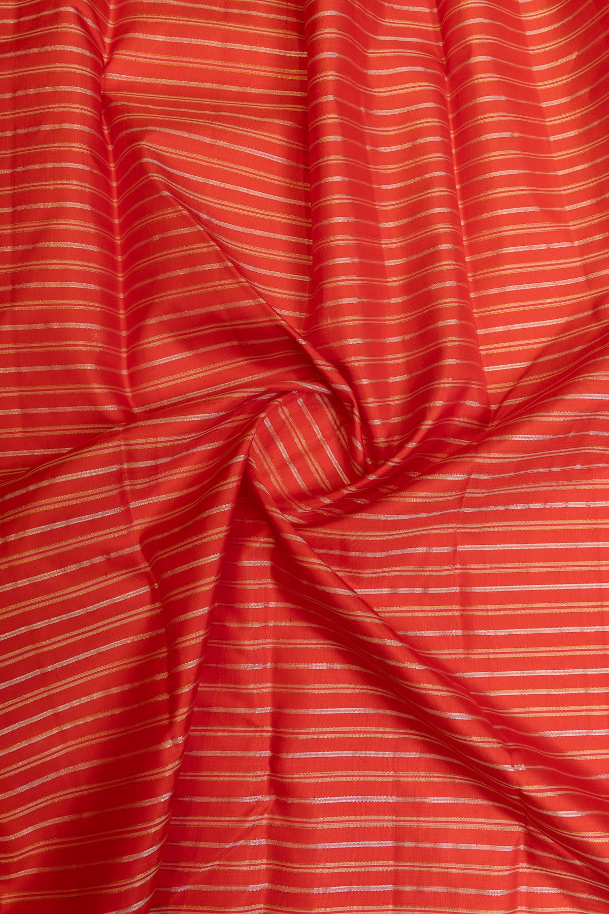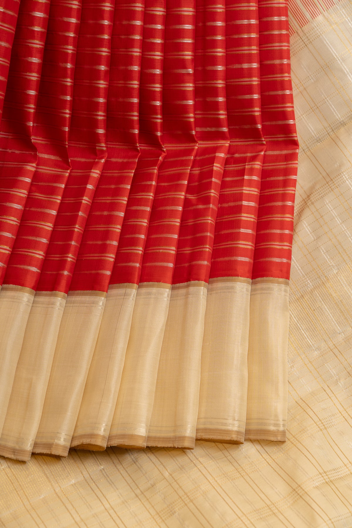Embrace timeless elegance with this red and ivory striped pure Kanchipuram silk saree. Handwoven from authentic Kanchipuram silk, this classic design features crisp stripes that balance bold red with pristine ivory, creating a striking yet refined aesthetic. The precision striping showcases the weaver's mastery, while the natural silk luster enhances the saree's inherent sophistication. Perfect for weddings, festivals, and formal occasions, this versatile piece transitions seamlessly from day to evening wear. The superior quality of pure Kanchipuram silk ensures exceptional durability and a graceful drape that flatters every silhouette. An enduring investment that celebrates traditional South Indian craftsmanship with understated luxury.