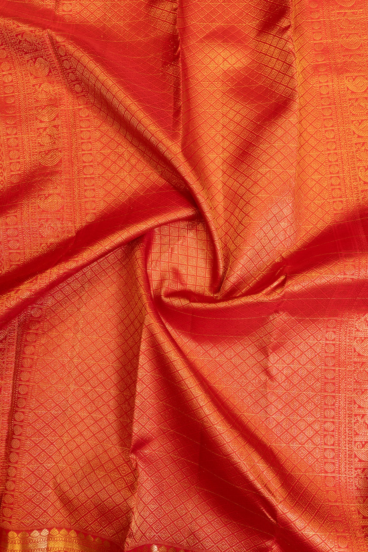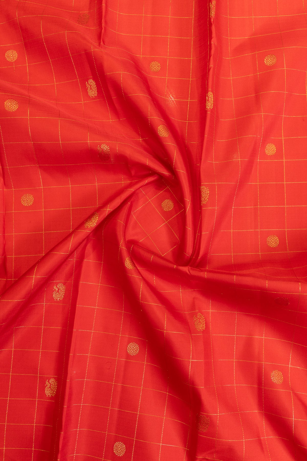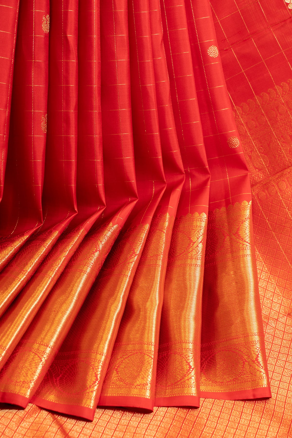 Introducing our stunning Red Zari Checks Traditional Pure Kanchipuram Silk Saree. Handcrafted with care, this saree features intricate zari checks that add an elegant touch to the vibrant red color. Made from pure Kanchipuram silk, this saree is lightweight and perfect for any special occasion. Elevate your style and grace with this traditional saree.