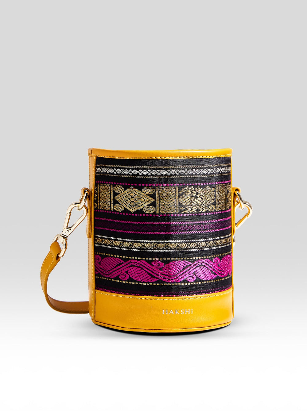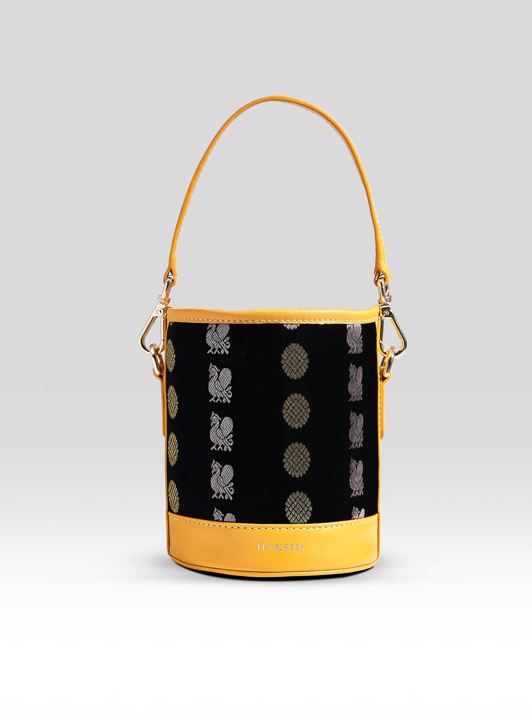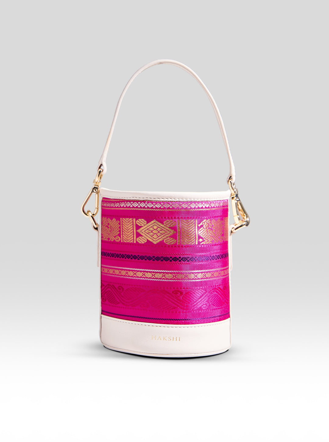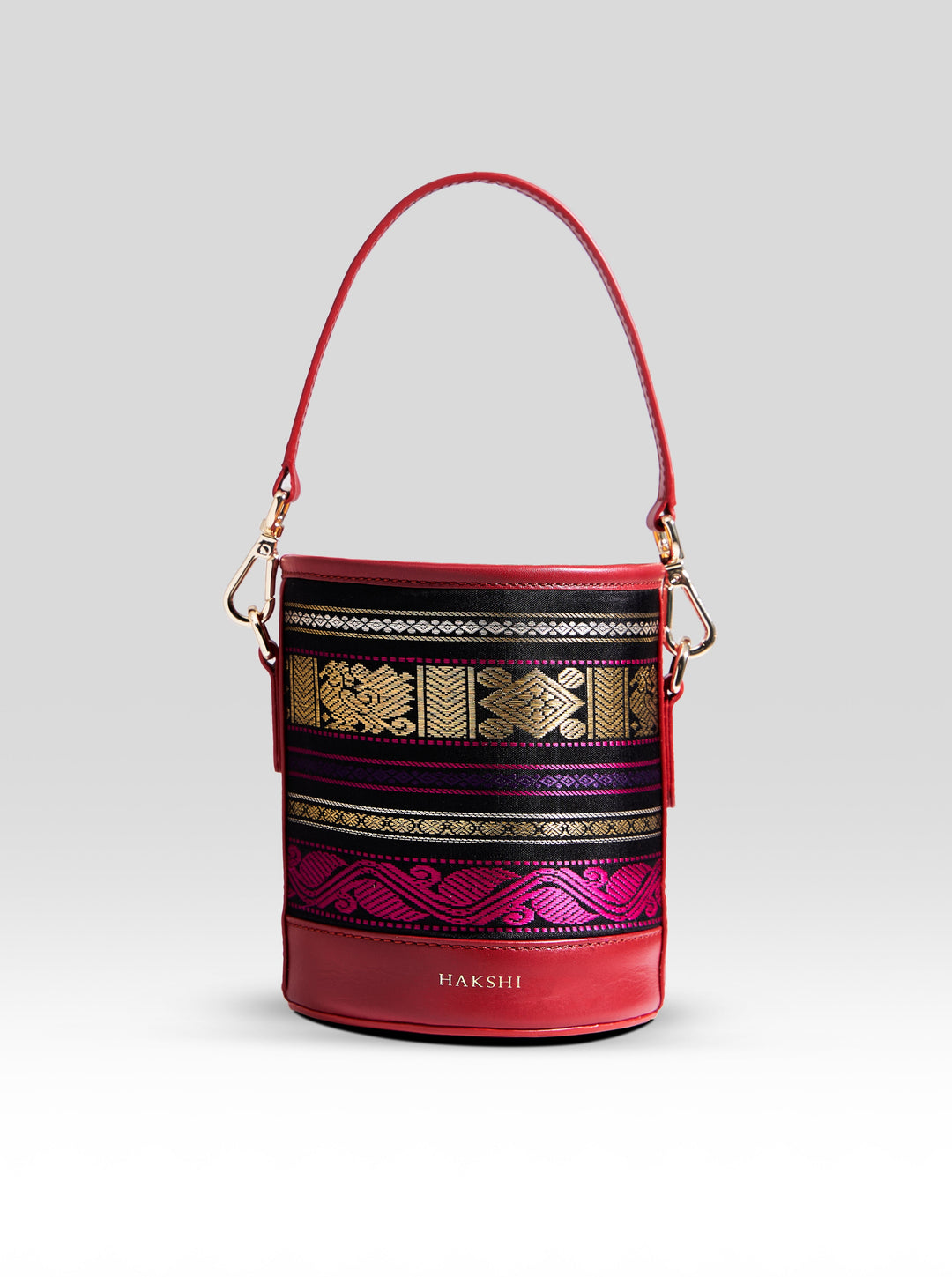 Adhya bucket bags are the world's first Kanchipuram silk bucket bags made from Pure Kanchipuram silk and Ethically Sourced genuine leather. The bags are meticulously handcrafted with handloom Kanchipuram silks with pure zari. Every bag carries a unique design and story that preserves the heritage of Kanchi silks and can be paired up with your Kanchipuram silk saree with ease. Our bags are a testament to our unwavering commitment to exceptional quality and impeccable craftsmanship, ensuring that our rich heritage is upheld in every aspect. Check out our world-exclusive collection of Kanchipuram silk bags and make sure to be the talk of any occasion.